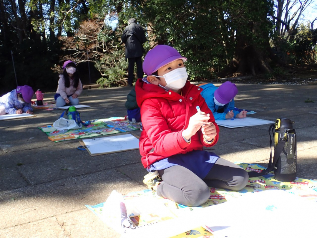 作品展に向けて、子ども達はいろいろな題材の絵に取り組んでいます。年長組は「中山法華経寺コース」と「消防ポンプ車コース」の2コースに分かれて、幼稚園の外に絵を描きに行きました。