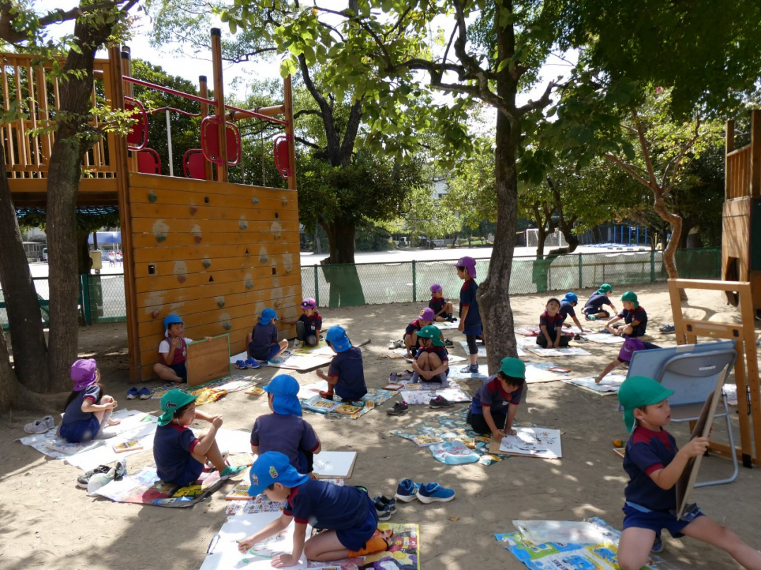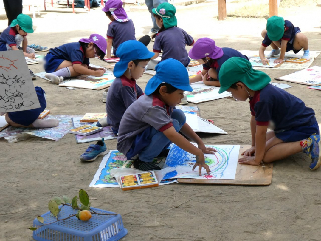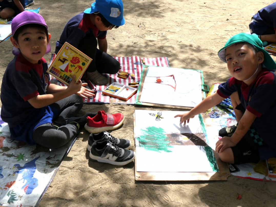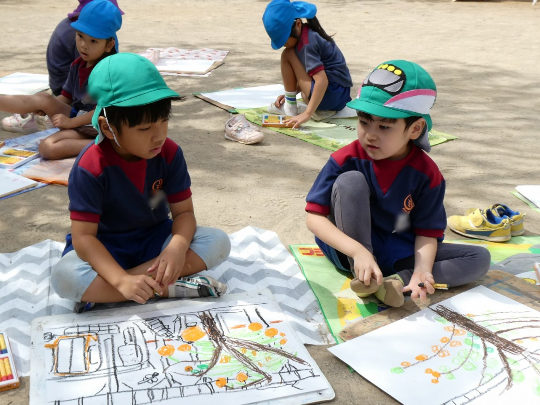 「秋の自然を感じて絵を描こう」と、みんなで園庭に広がって絵を描きました。美味しそうな果物の木、元気いっぱいの虫、ニコニコ笑顔で遊んでいる自分と友達…楽しい絵がいっぱい描けましたね♪