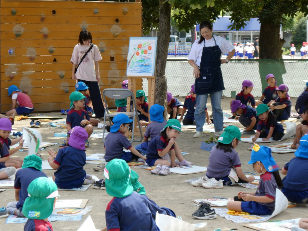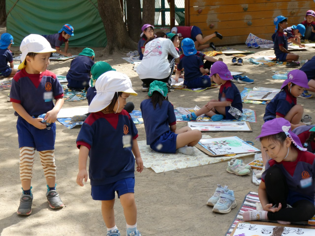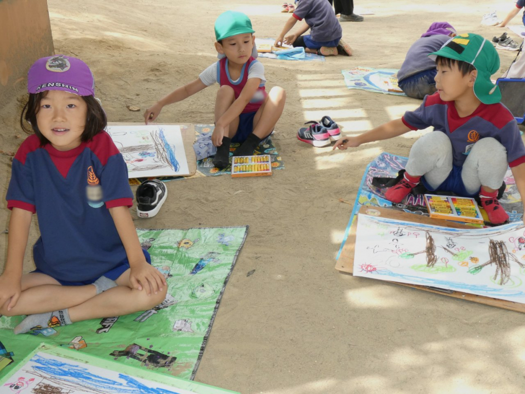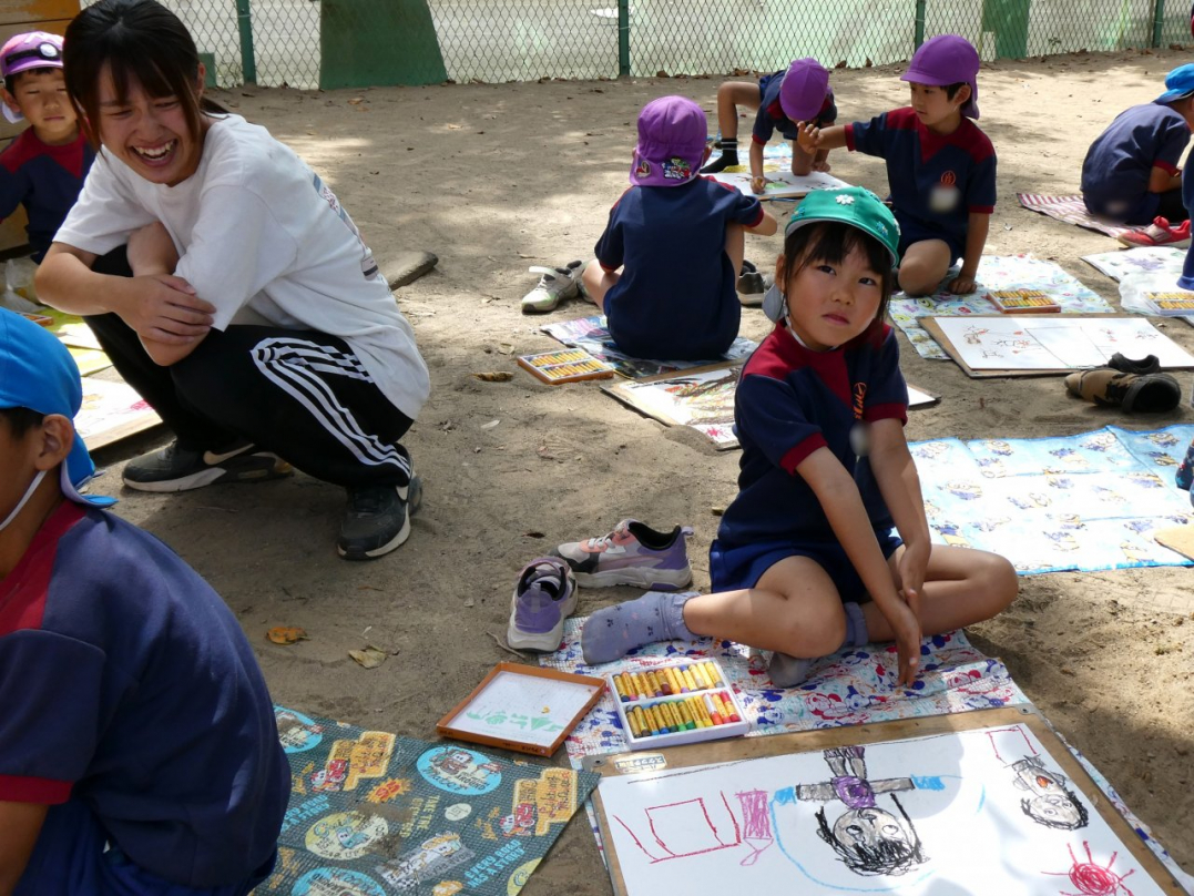 「秋の自然を感じて絵を描こう」と、みんなで園庭に広がって絵を描きました。美味しそうな果物の木、元気いっぱいの虫、ニコニコ笑顔で遊んでいる自分と友達…楽しい絵がいっぱい描けましたね♪