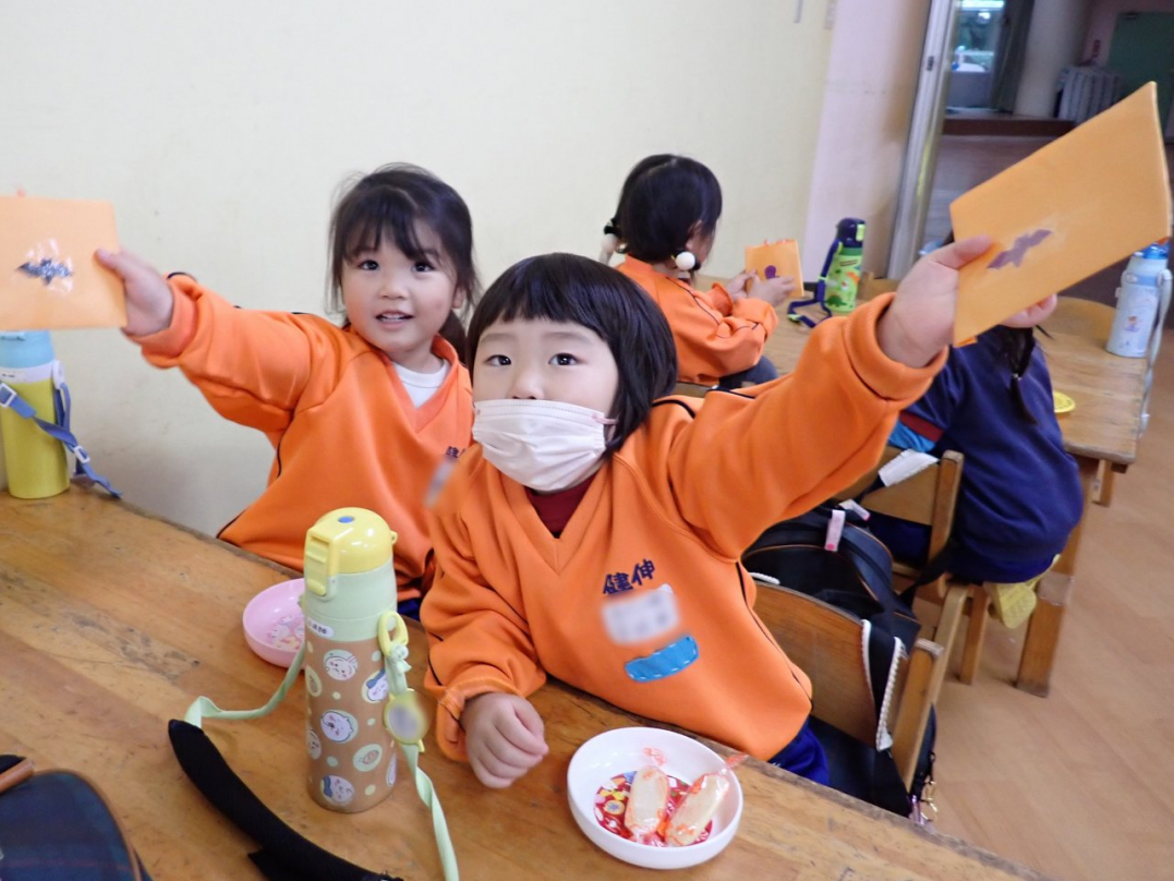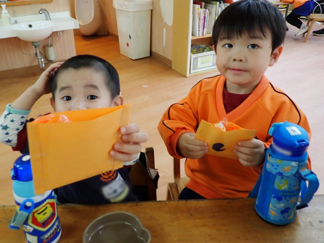 今日は、自分で作ったランタンや飾り、バック等の製作物を持って、「トリックアンドトリート!」で、おやつタイムを楽しみました。
