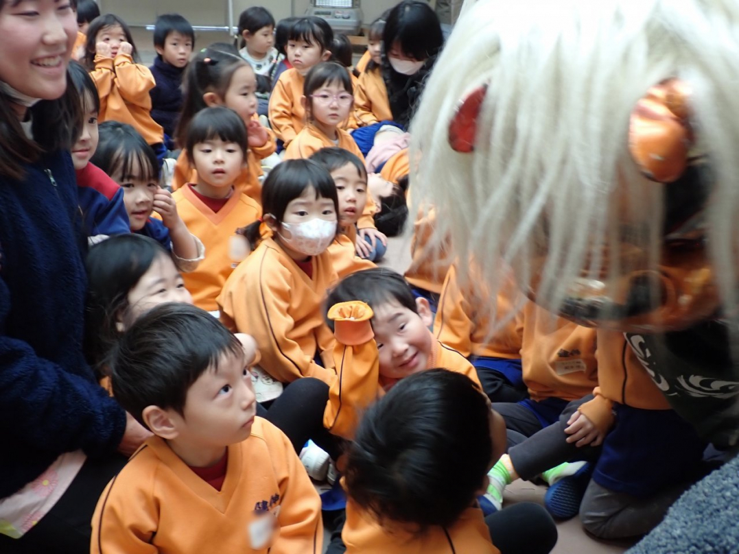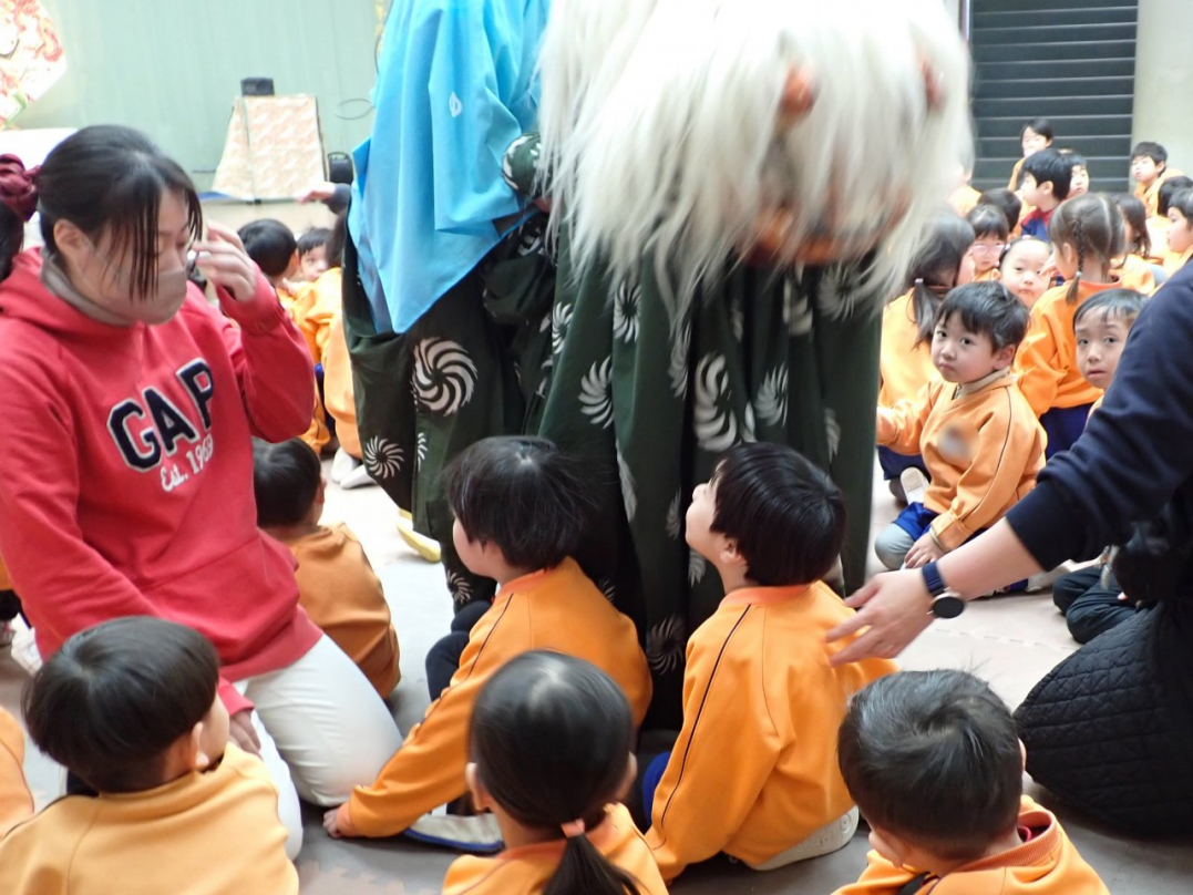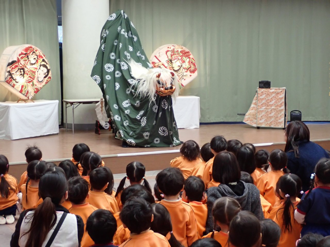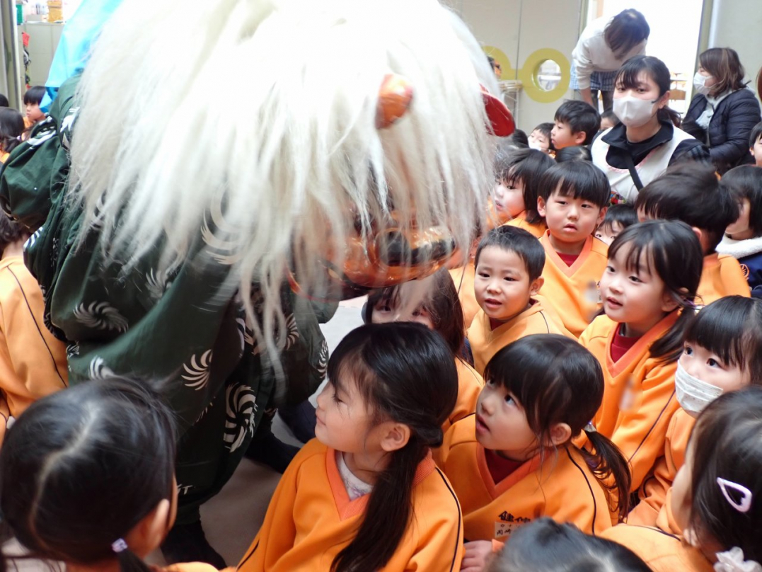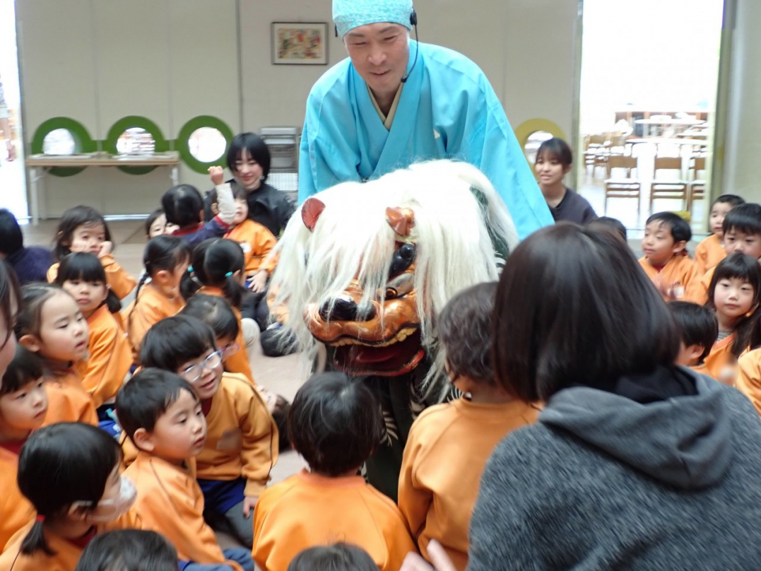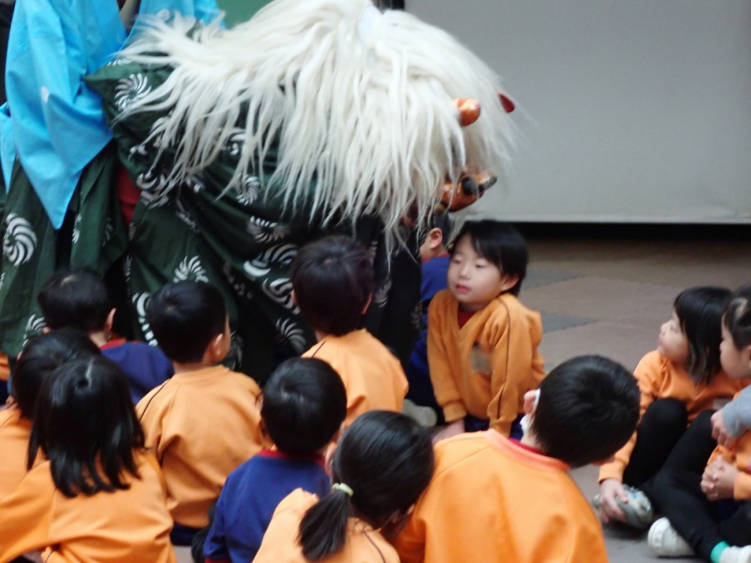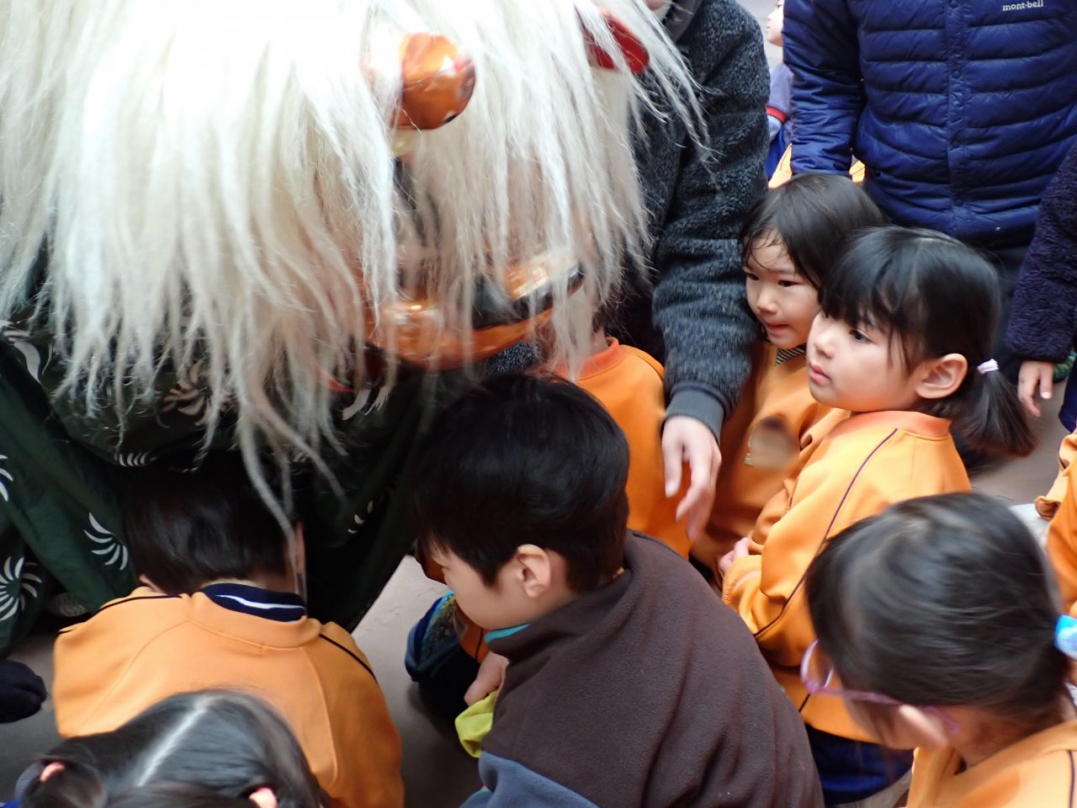 毎年一年のはじめに、獅子舞が幼稚園に遊びにきてくれます。「厄払い」や「無病息災を祈る」意味がある獅子舞に、かぷっと頭をかじられて、ちょっとドキドキしながらも「いい年になるね」と子ども達は喜んでいましたよ。江戸神楽の伝統芸にも、子ども達は拍手で大喜び!とても楽しい一日でしたね♪
