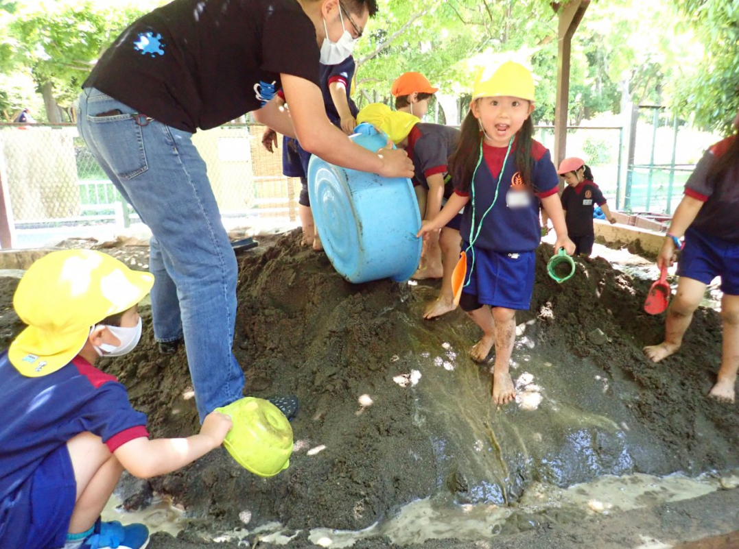 梅雨の合間の晴れた日、子ども達は園庭で元気いっぱいに遊んでいます。