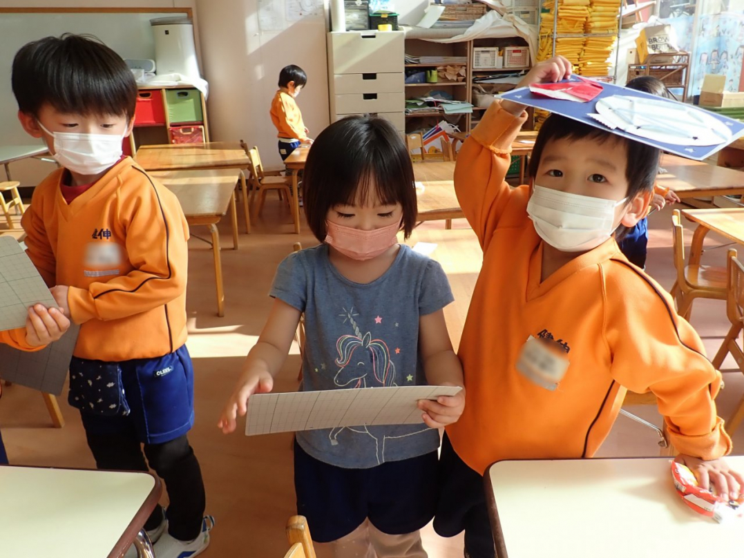 きれいな毛糸を上手に穴を通して、自分で作ったサンタさんの折り紙を貼ったら出来上がり!とてもかわいい壁飾りができました。子ども達の成長を感じる素敵な装飾です。ぜひご家庭でも飾って下さいね。