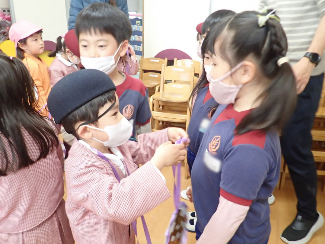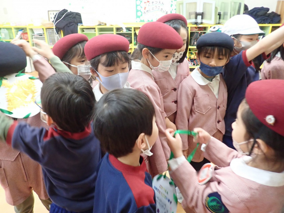 これまで一緒にいっぱい遊んだり、優しくしたりしてくれた「ひばり組さん」への感謝の気持ちをこめて、つばめ組みんなで手作りのメダルを作りました。キラキラ光る折り紙で作ったメダルの裏には「ありがとう」のメッセージ入りです。