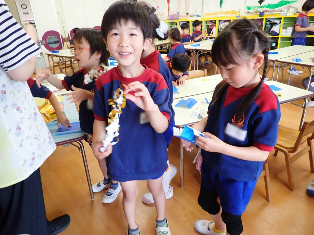 7月7日は七夕です。先生から七夕のお話を聞いた子ども達は、さっそく七夕飾りを作って、お願い事を書いた短冊と一緒に笹に結び付けて飾りました。色とりどりに飾られた笹を見て、子ども達は七夕を楽しみにしていました。