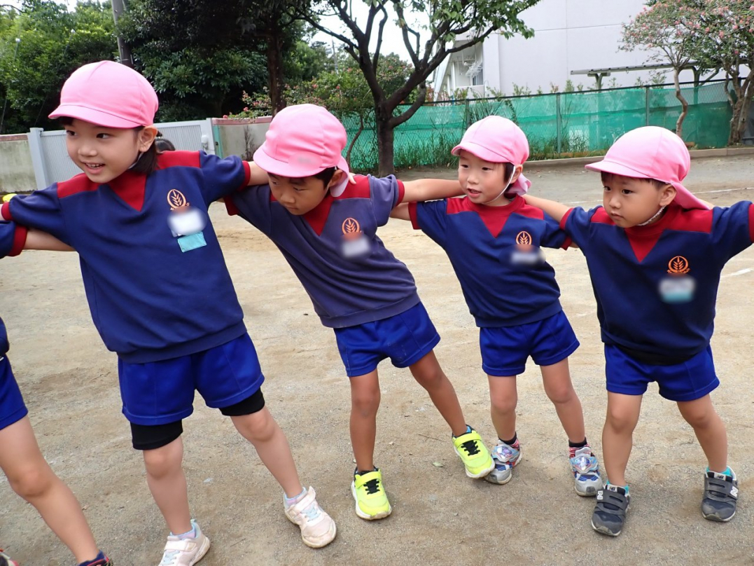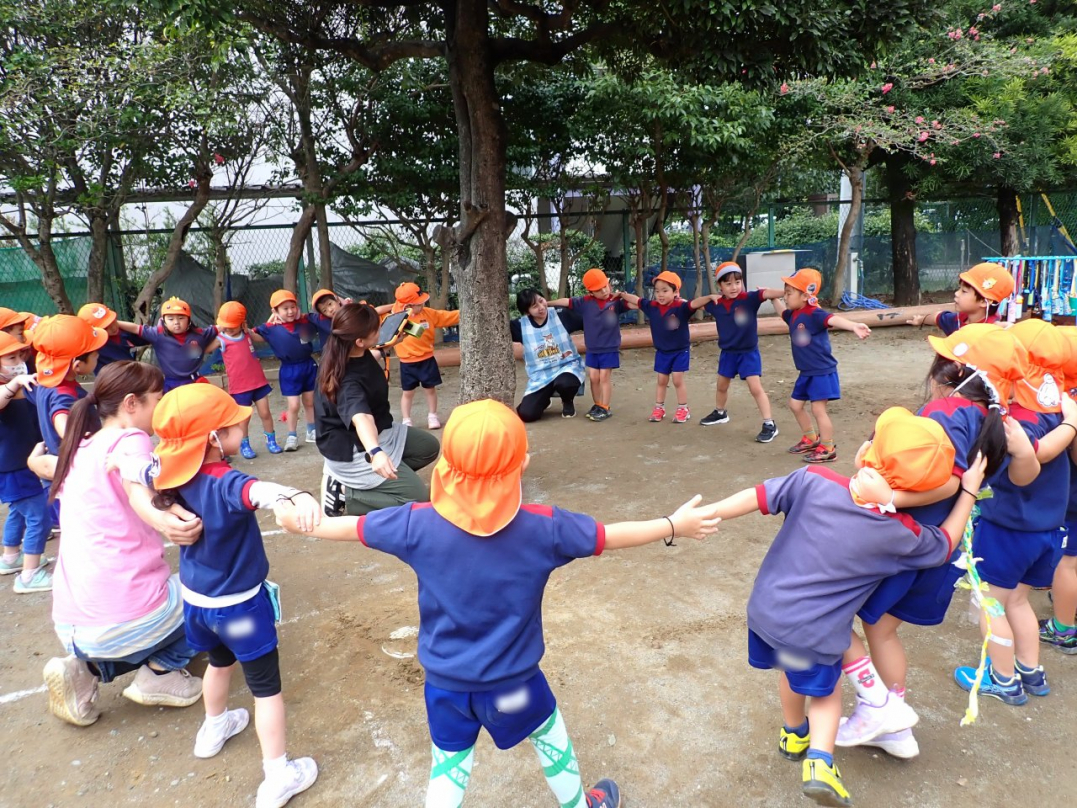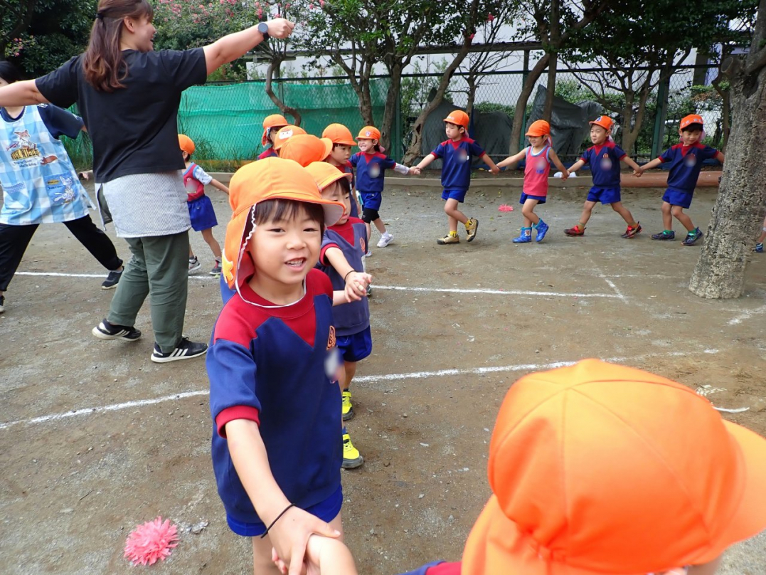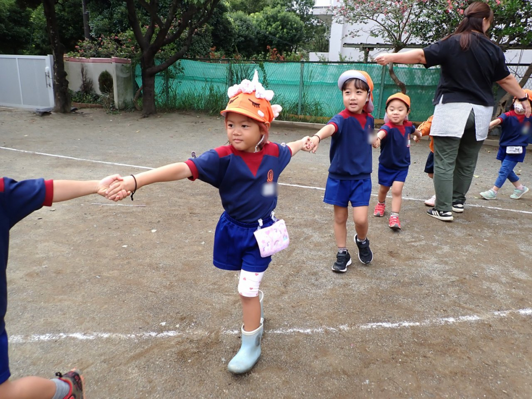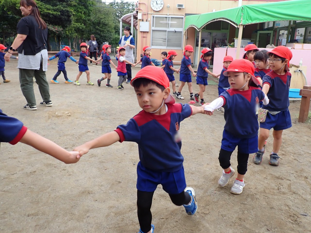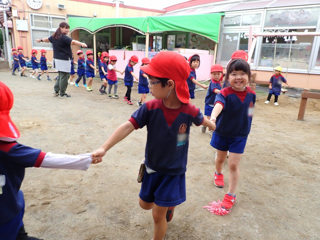 今年の運動会では、手をつないで列をつくったり、円を描いたりと、友達と力を合わせてチャレンジしています。