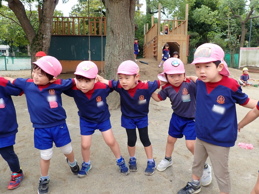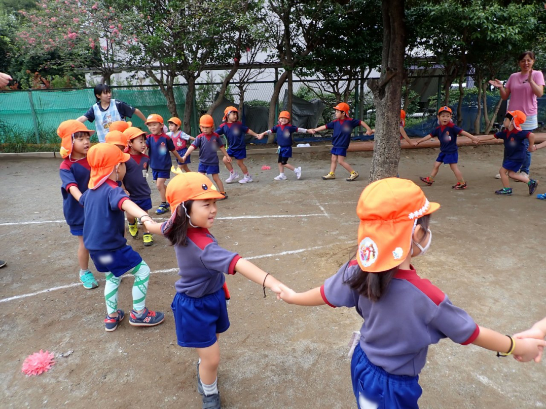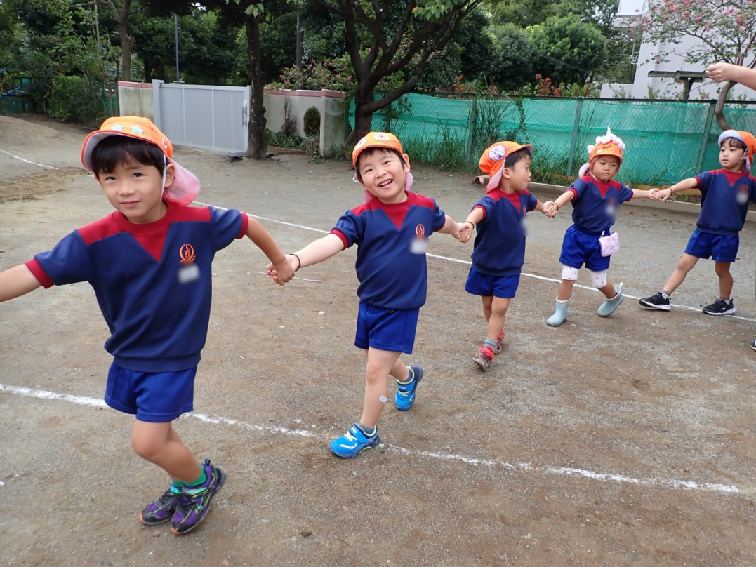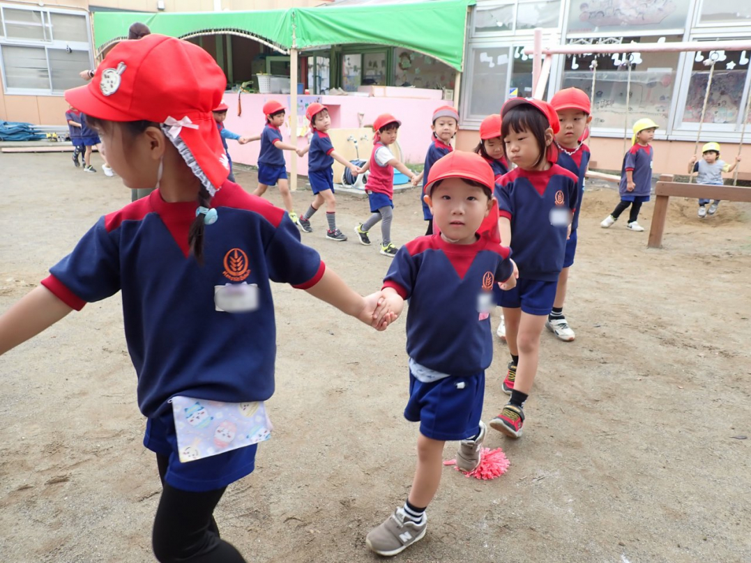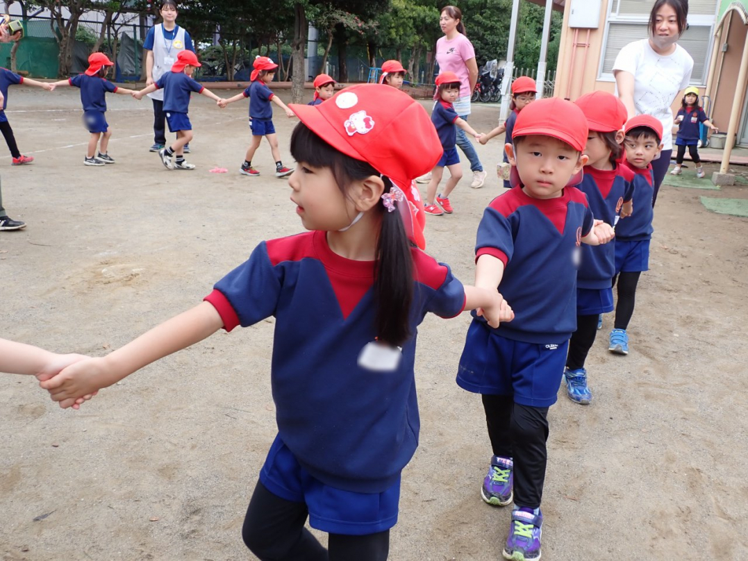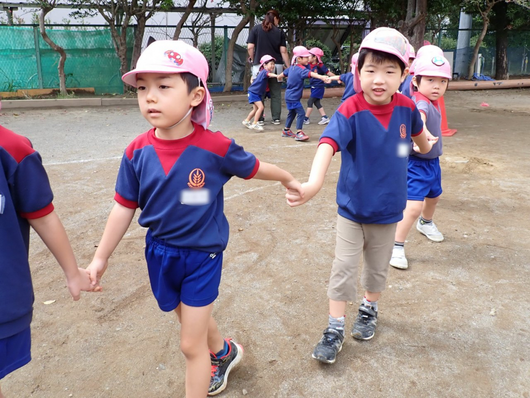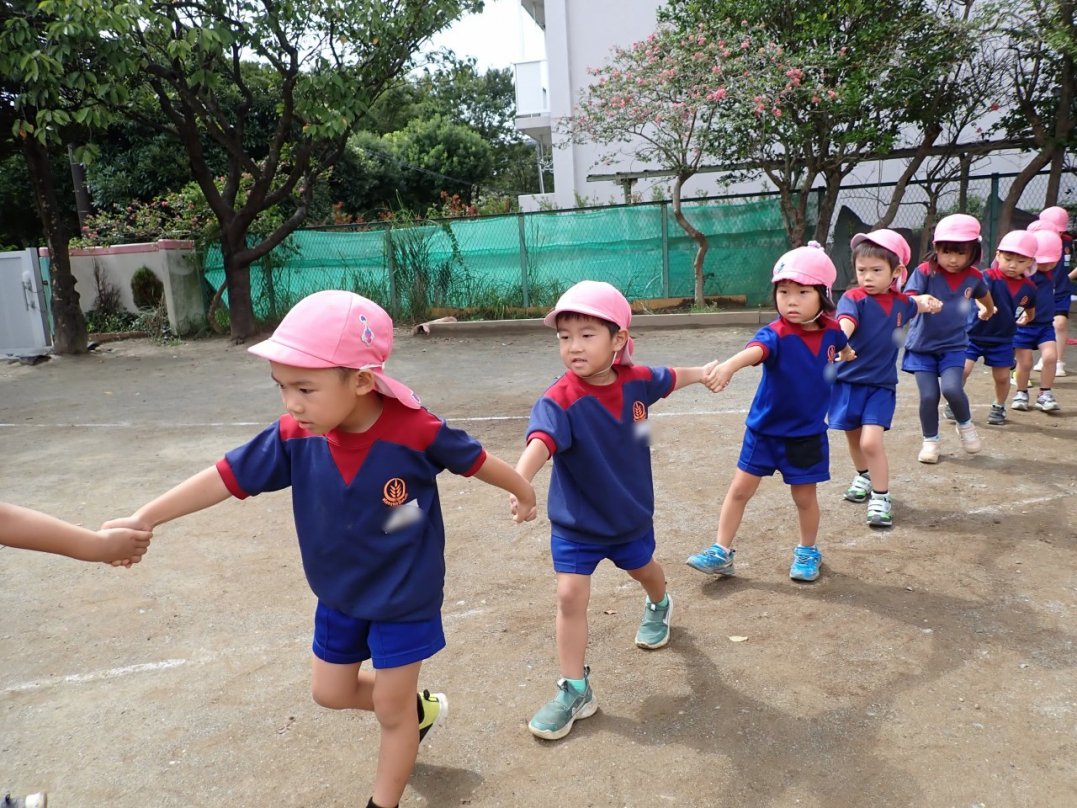 今年の運動会では、手をつないで列をつくったり、円を描いたりと、友達と力を合わせてチャレンジしています。
