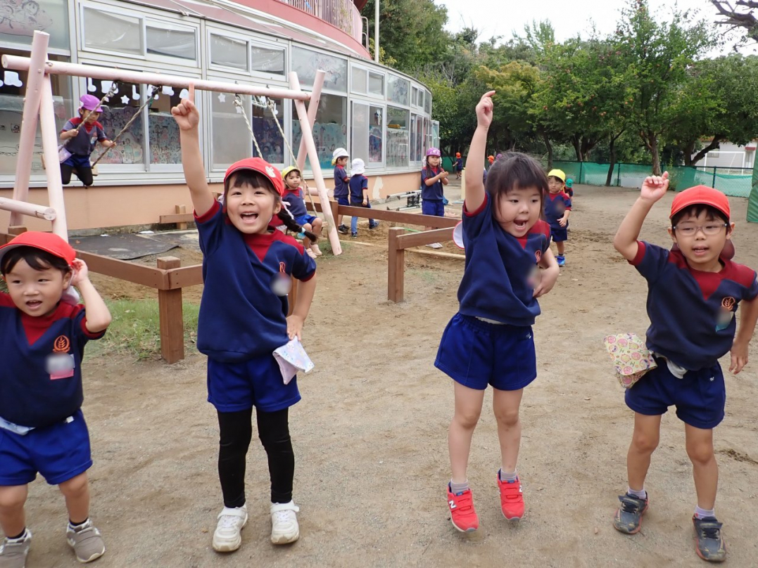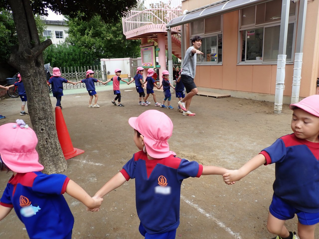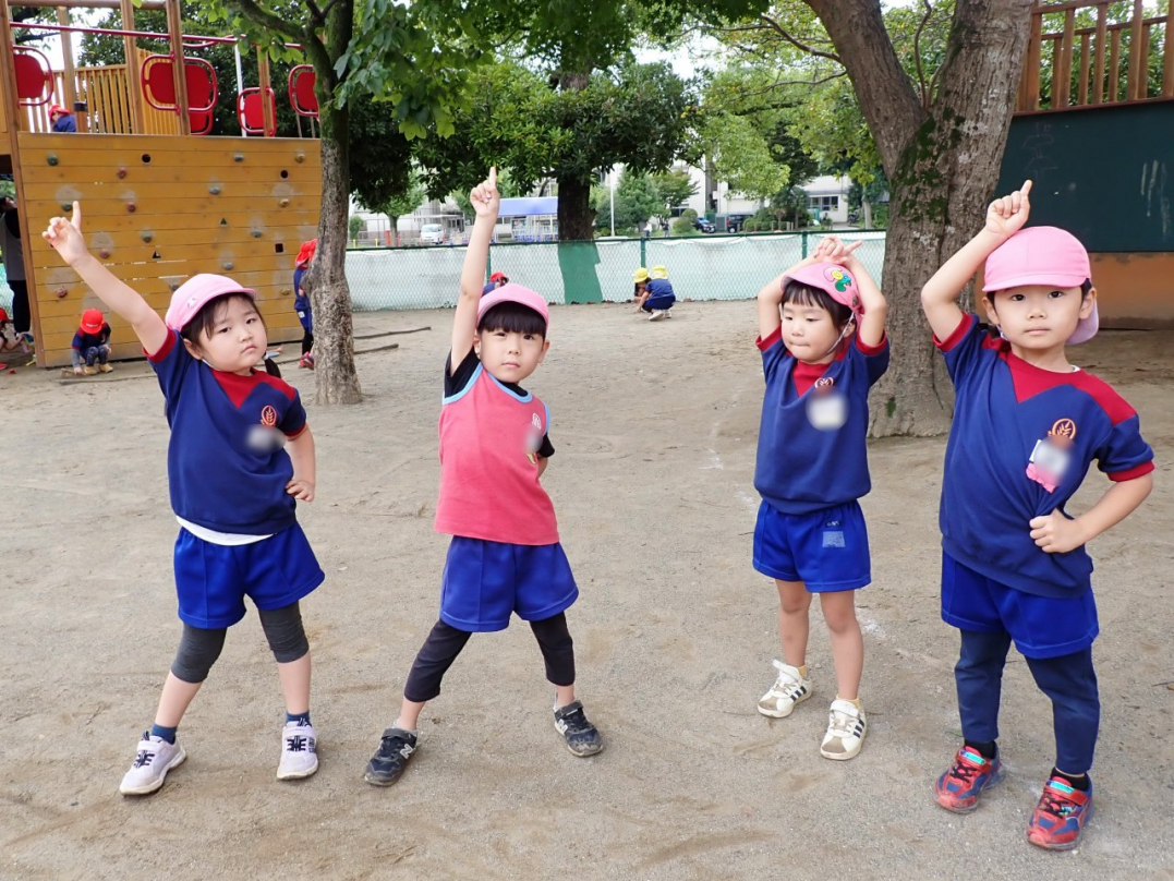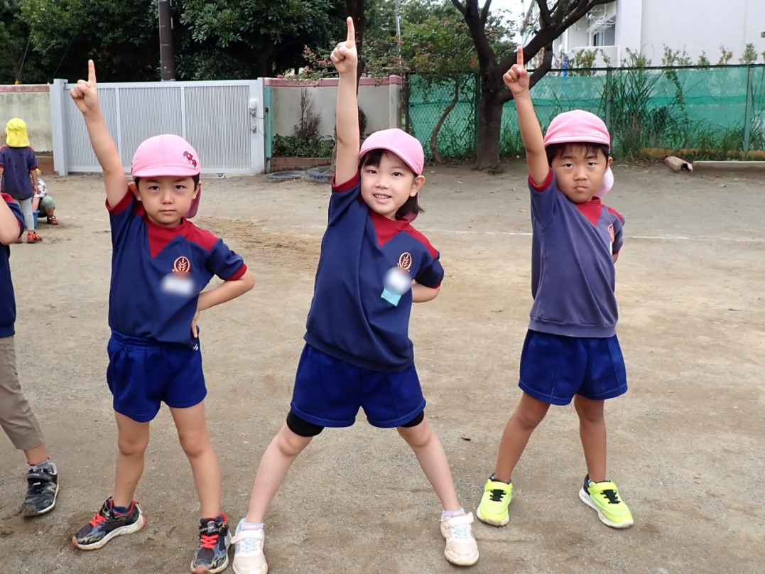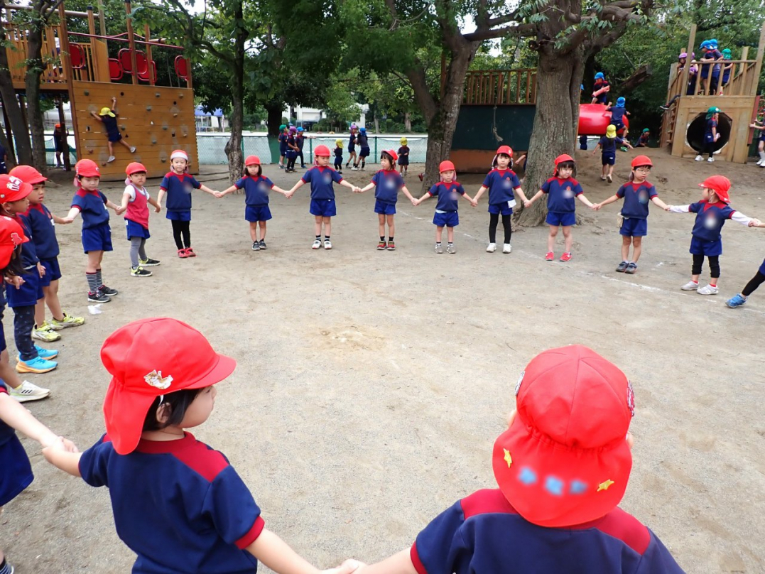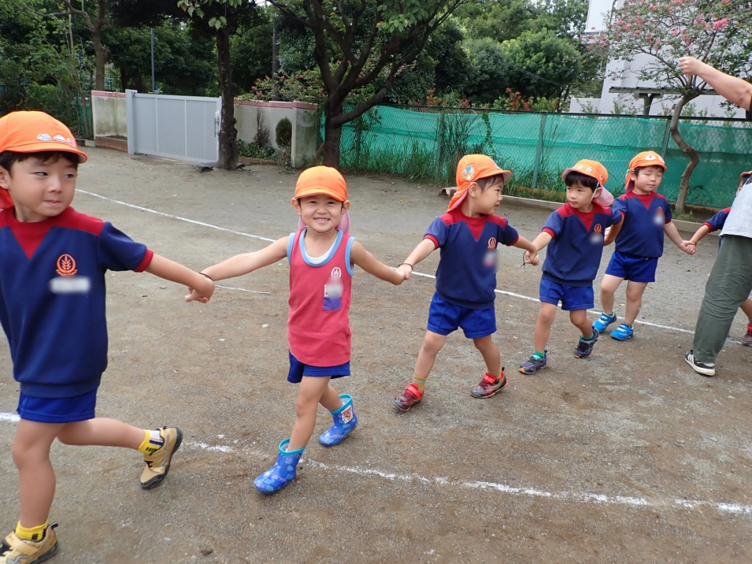 今年の運動会では、手をつないで列をつくったり、円を描いたりと、友達と力を合わせてチャレンジしています。