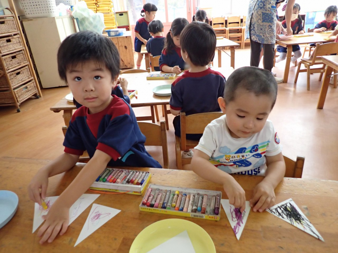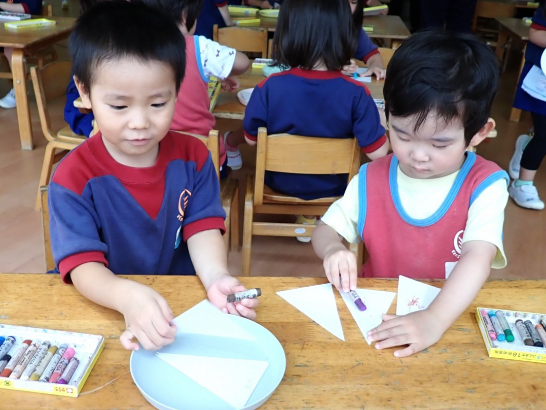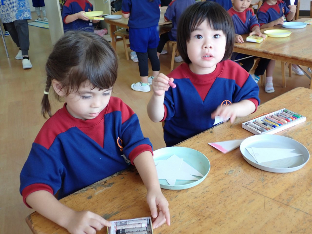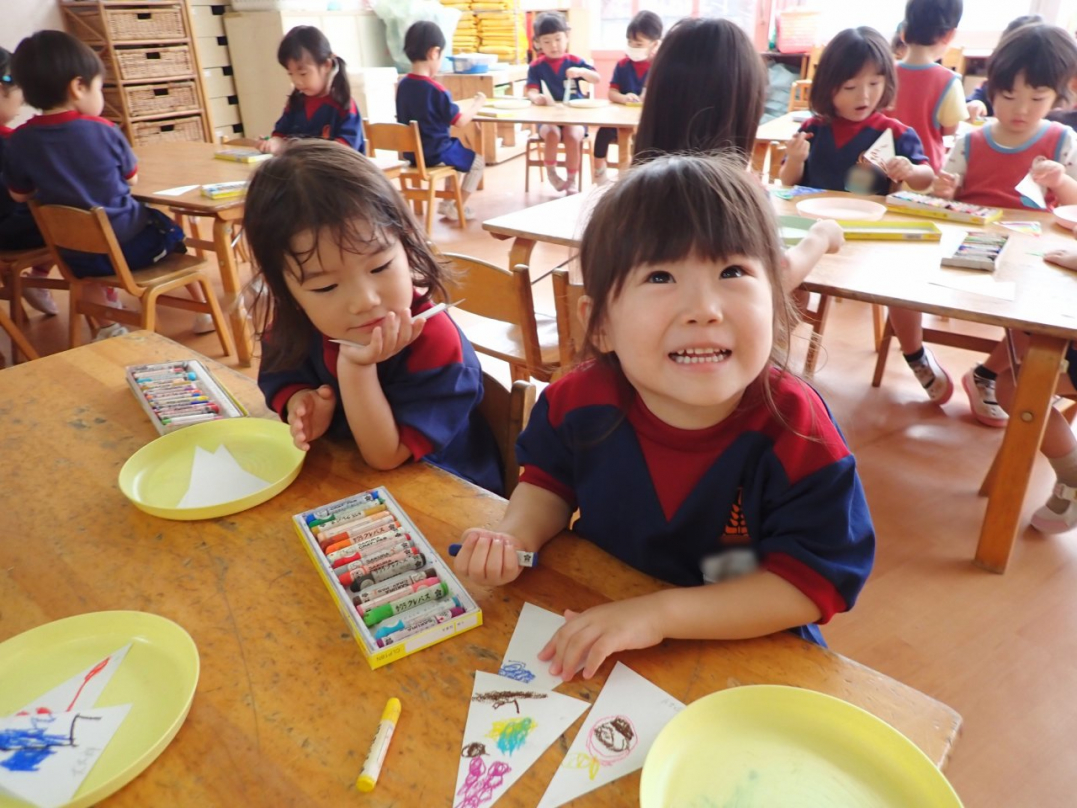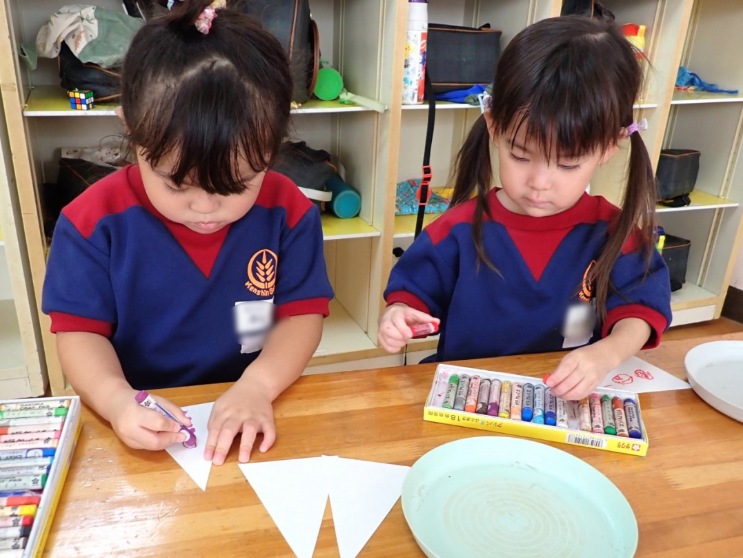 ダンスでかぶる帽子作りにもチャレンジしました。クレパスで絵を描いて、好きな色を塗って作った帽子です。子ども達も楽しんで作る様子が見られましたよ♪