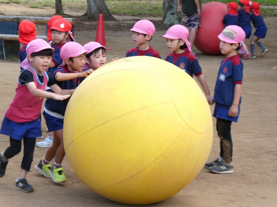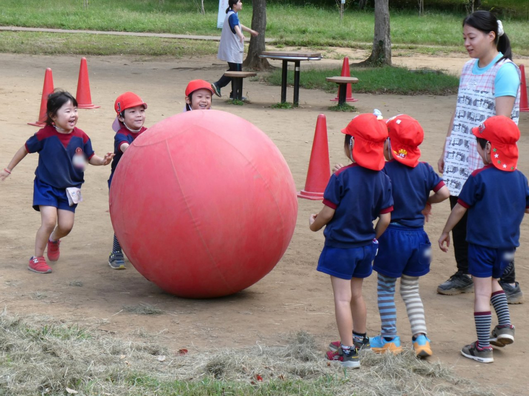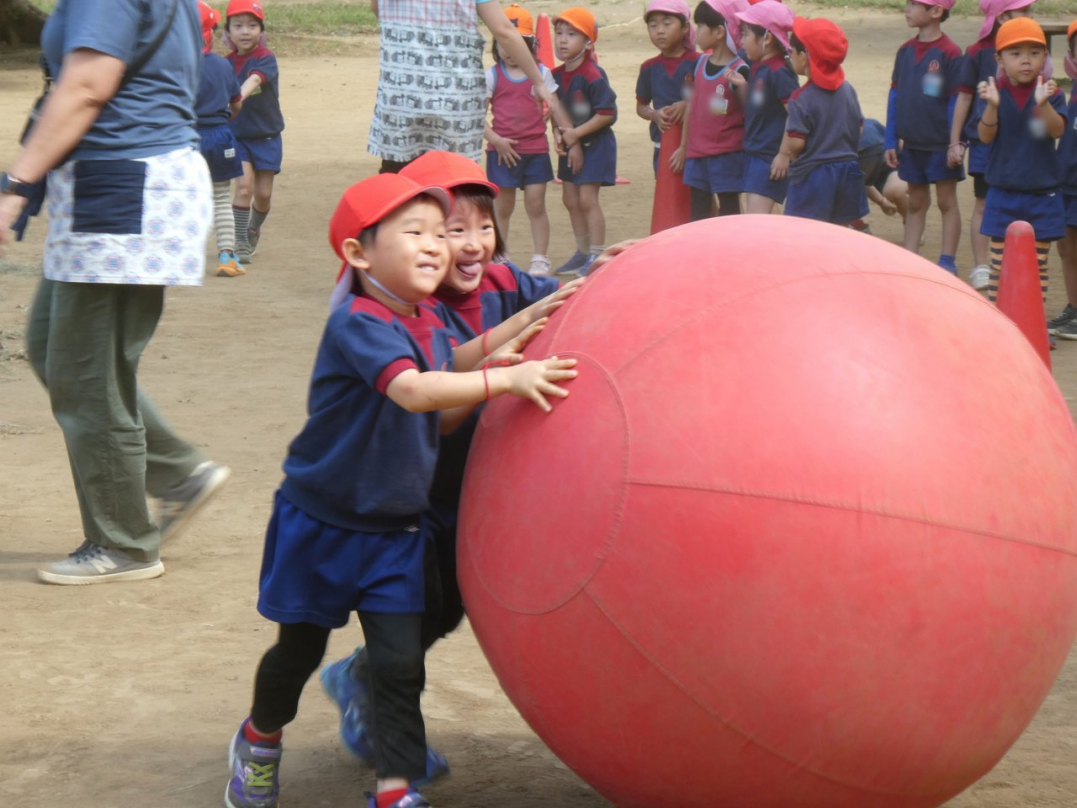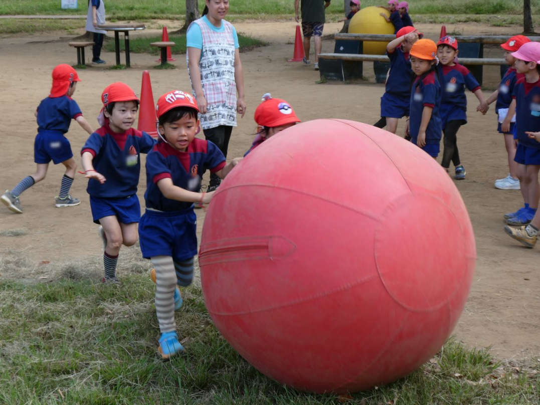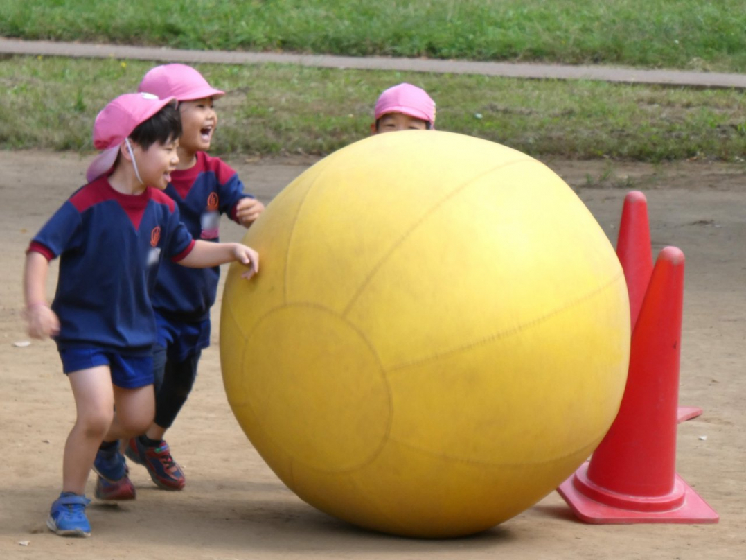 運動会のつばめ組のゲーム競技は「大玉転がし」です。自分と同じくらい大きな大玉を、友達と力を合わせて転がします。