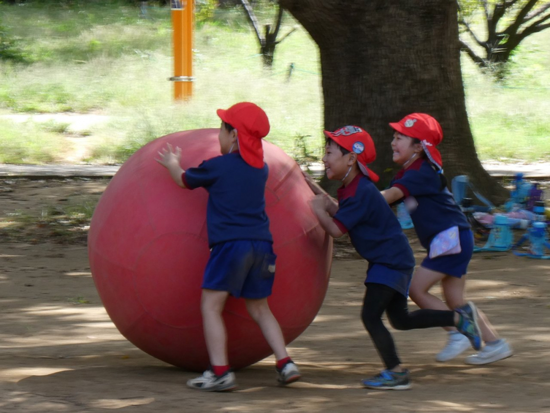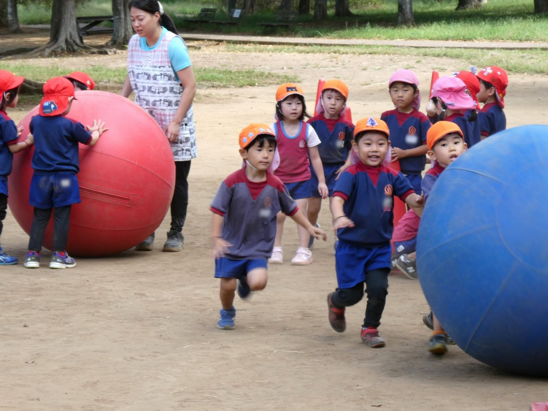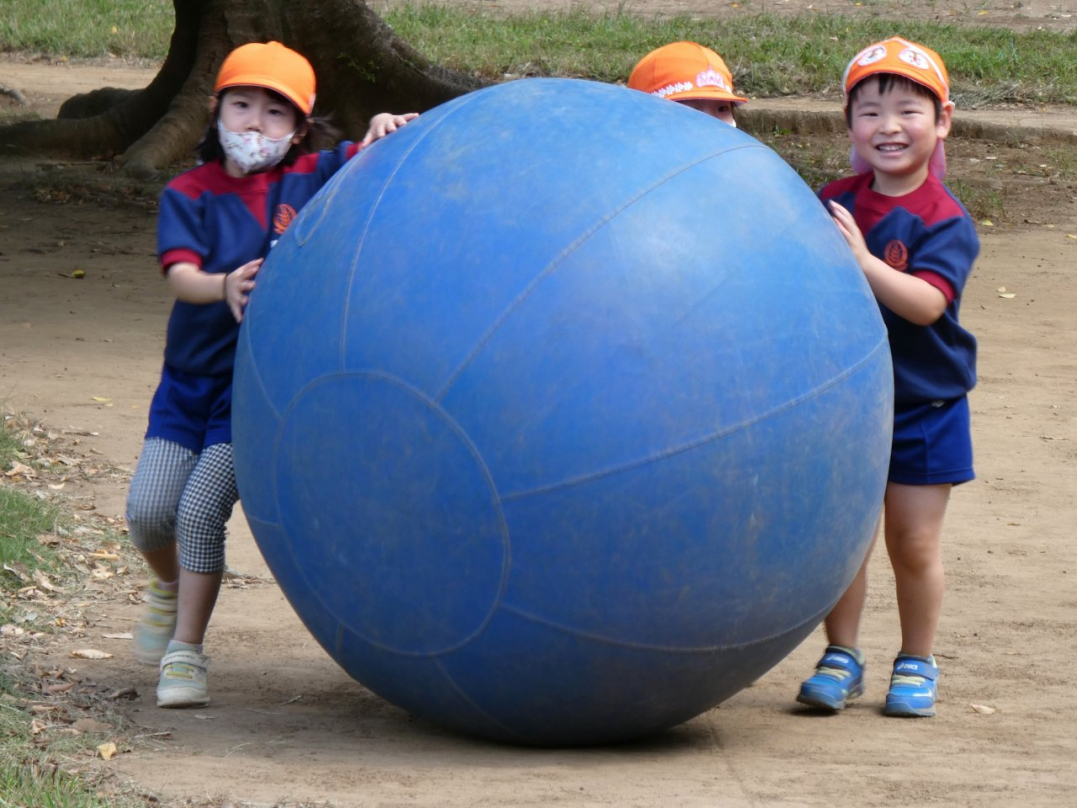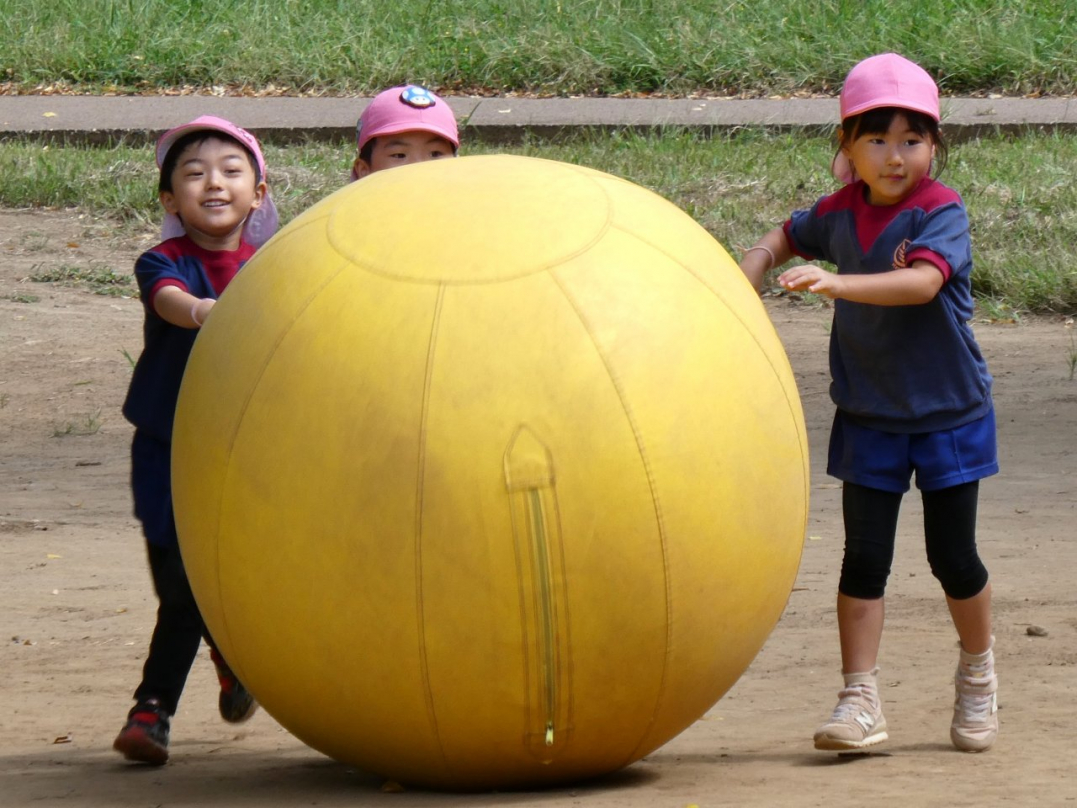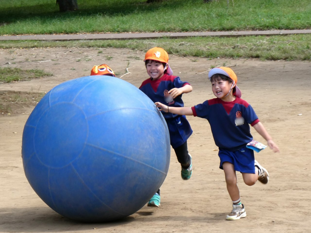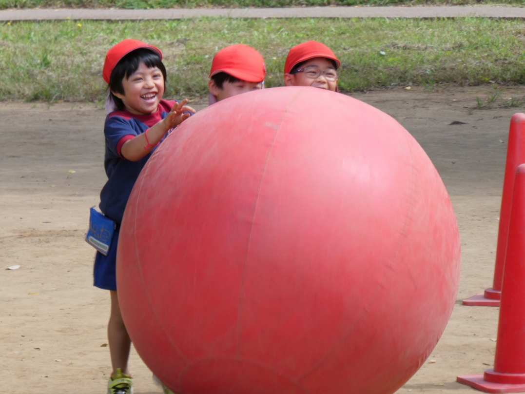 運動会のつばめ組のゲーム競技は「大玉転がし」です。自分と同じくらい大きな大玉を、友達と力を合わせて転がします。
