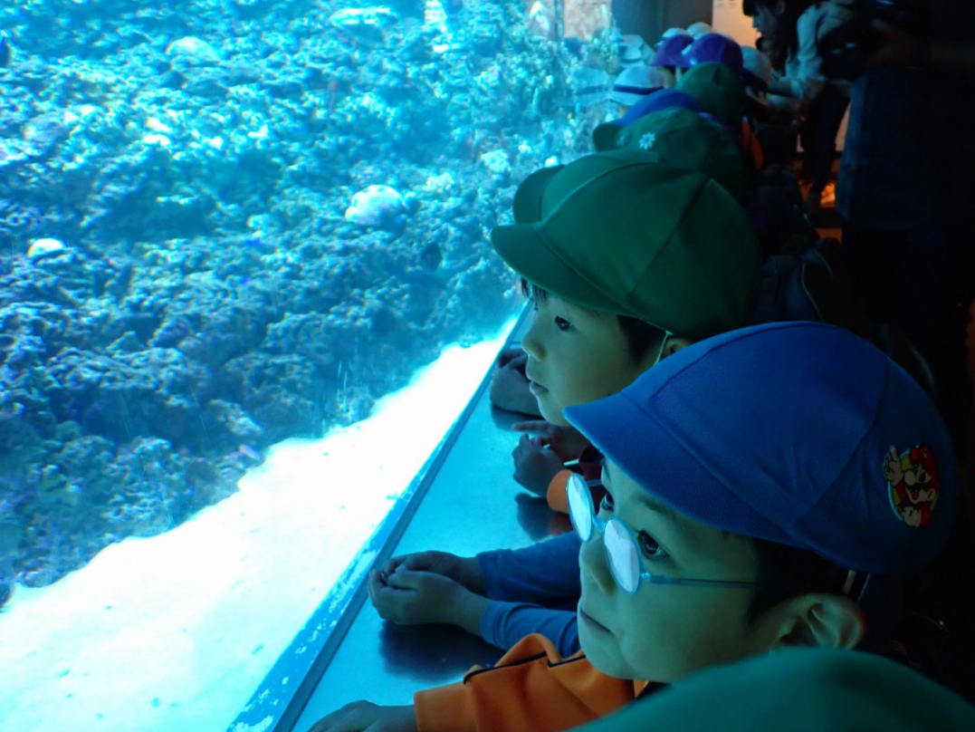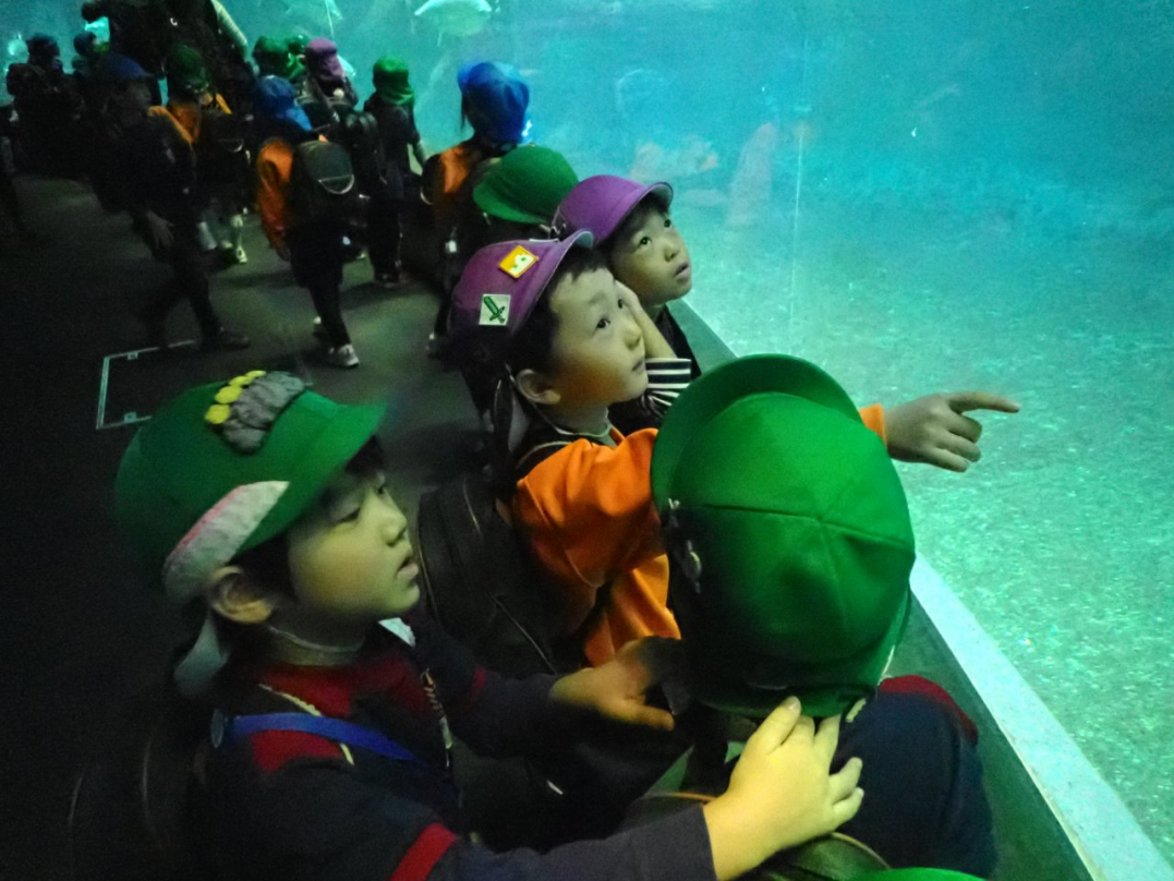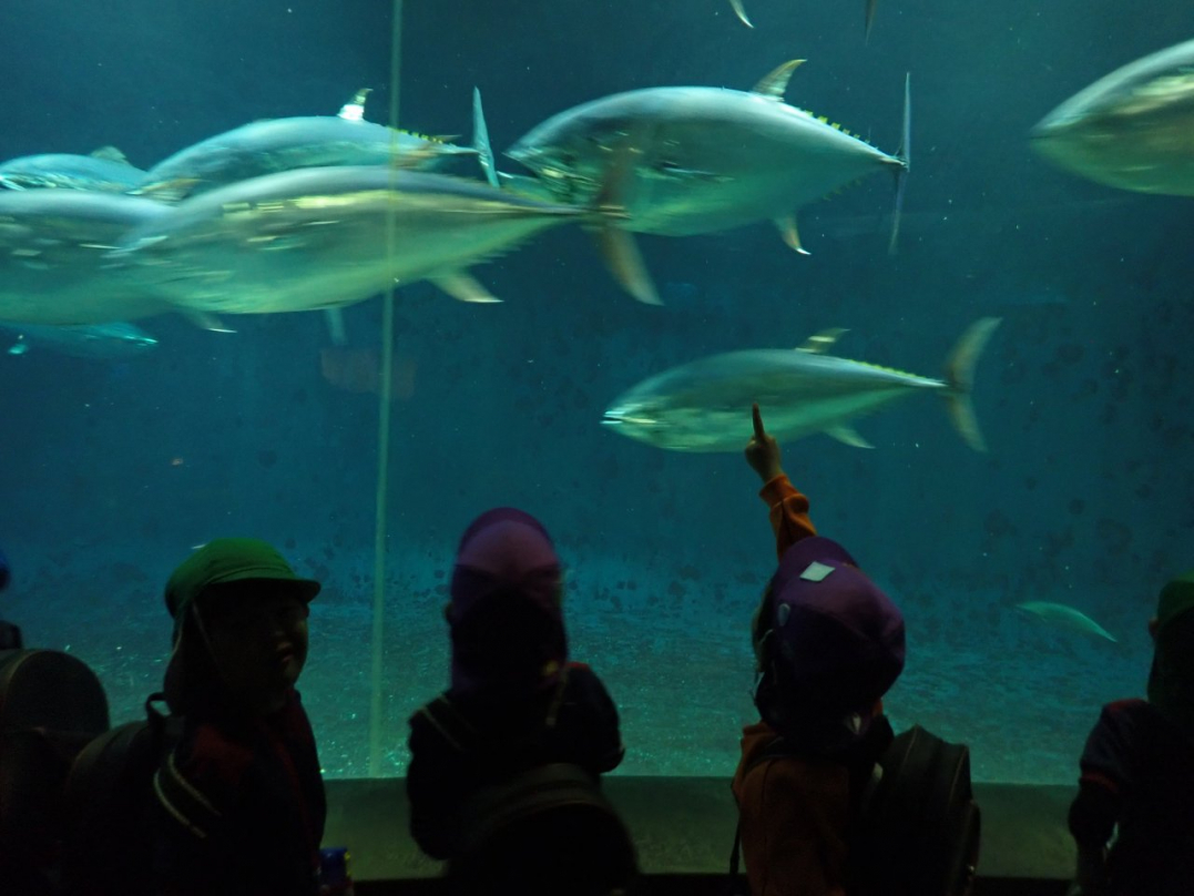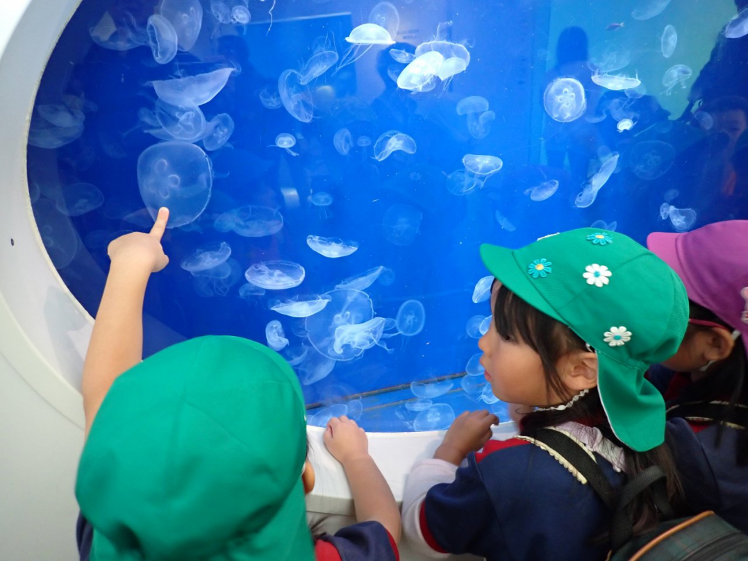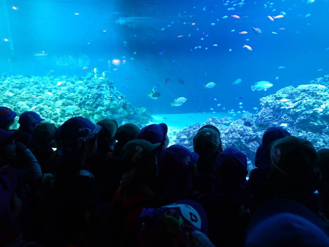 マグロやサメ、クラゲやペンギン等、たくさんの魚が元気に泳いでいる姿を見て、子ども達は大喜び!友達と「きれいだね」「かわいいね」と会話も盛り上がっていました。いっぱい見学してお腹もペコペコ。お昼ごはんで食べたカレーも「美味しい!」と大満足だったようです。