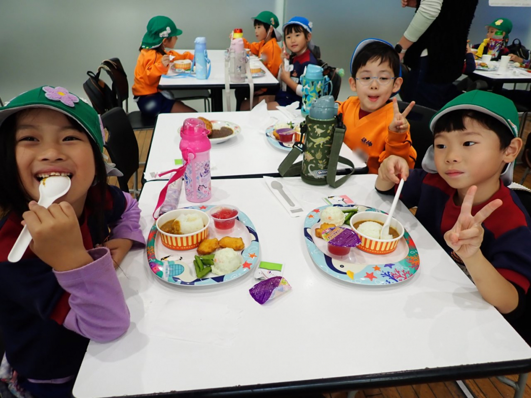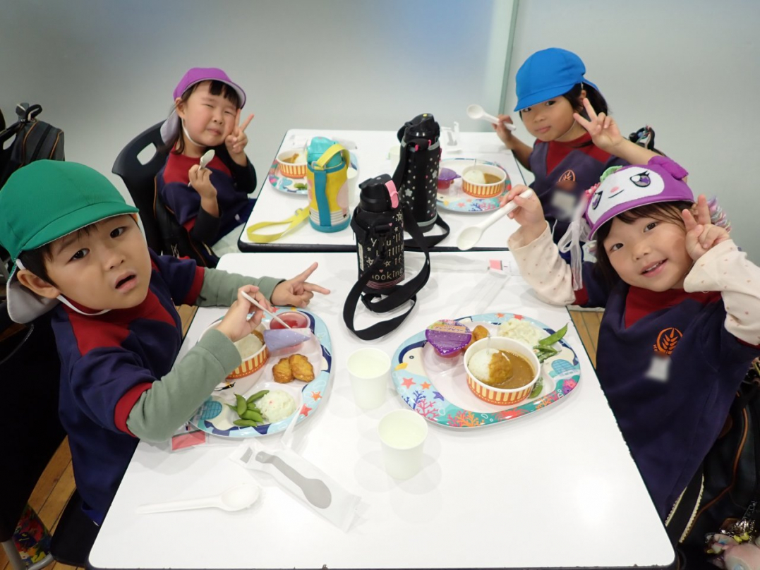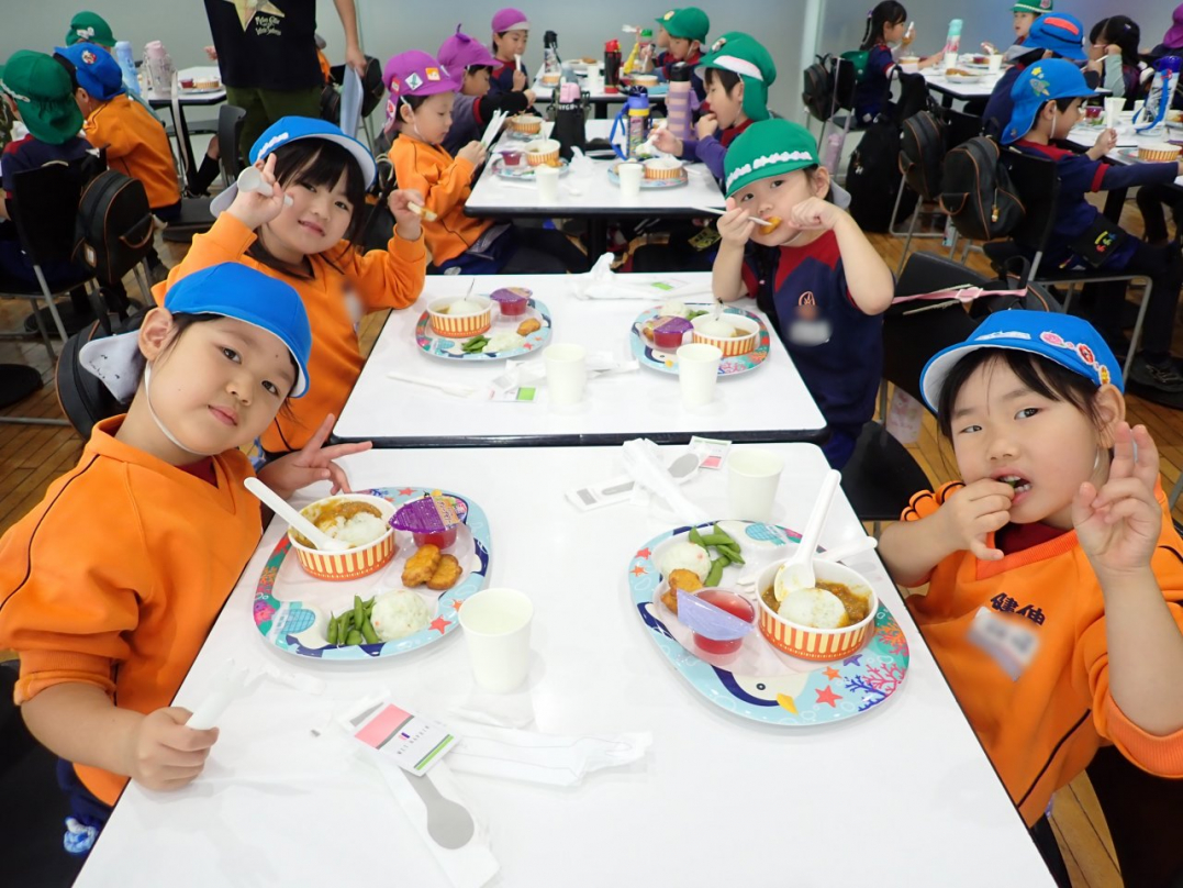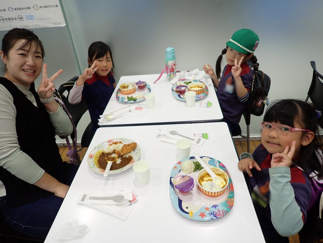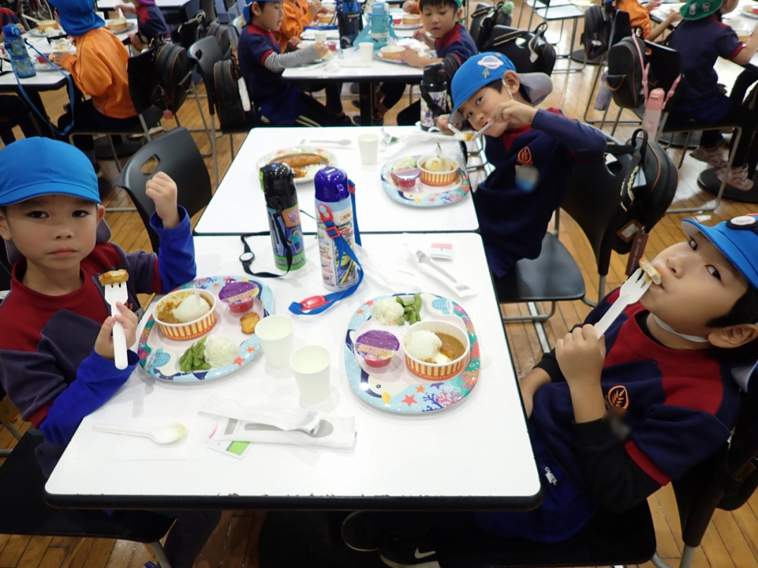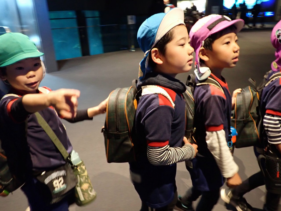 マグロやサメ、クラゲやペンギン等、たくさんの魚が元気に泳いでいる姿を見て、子ども達は大喜び!友達と「きれいだね」「かわいいね」と会話も盛り上がっていました。いっぱい見学してお腹もペコペコ。お昼ごはんで食べたカレーも「美味しい!」と大満足だったようです。
