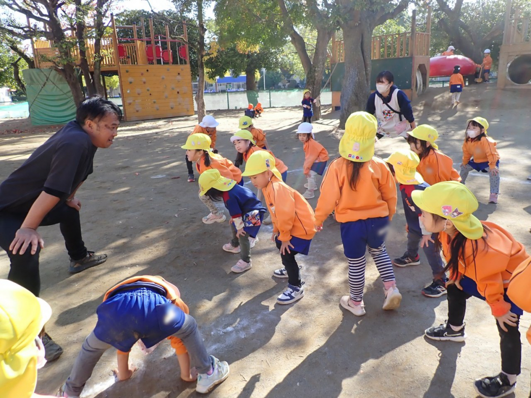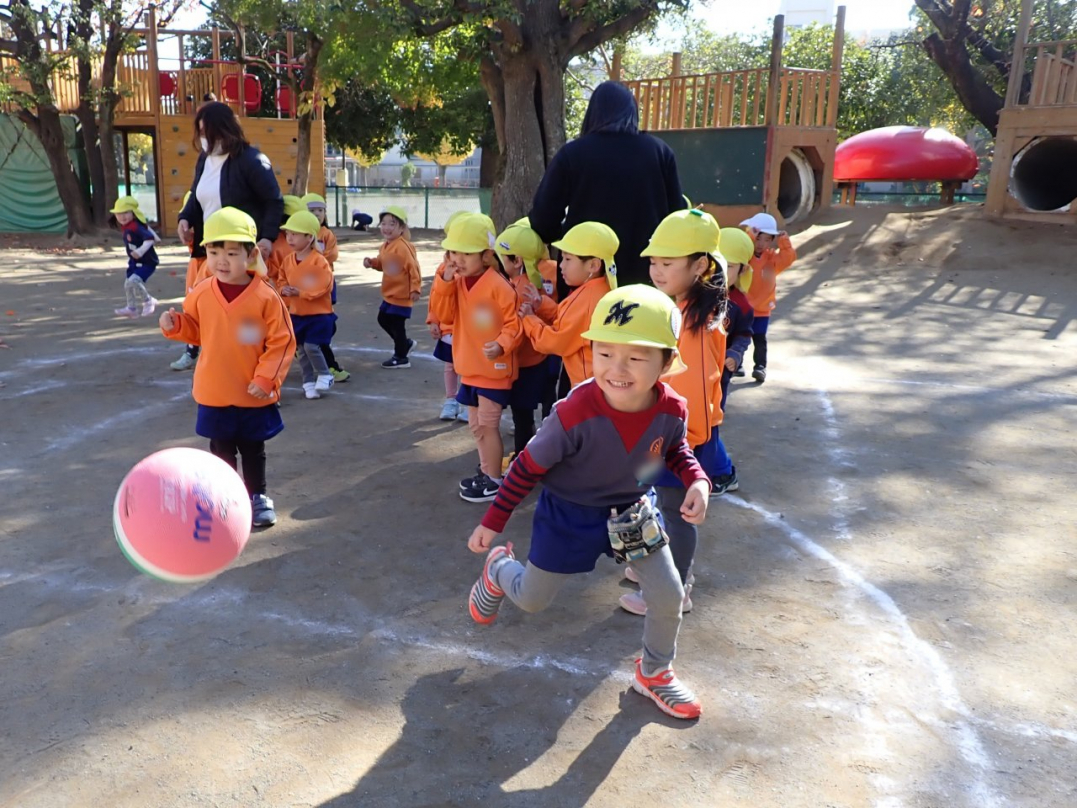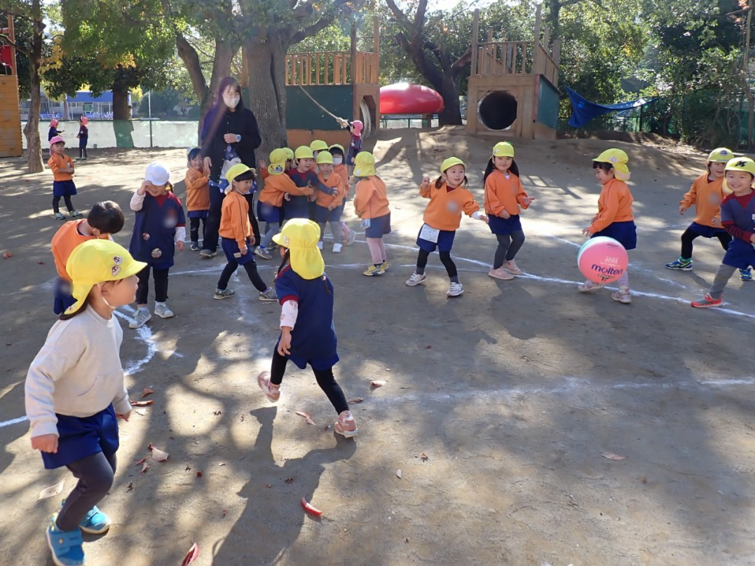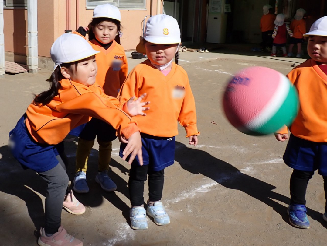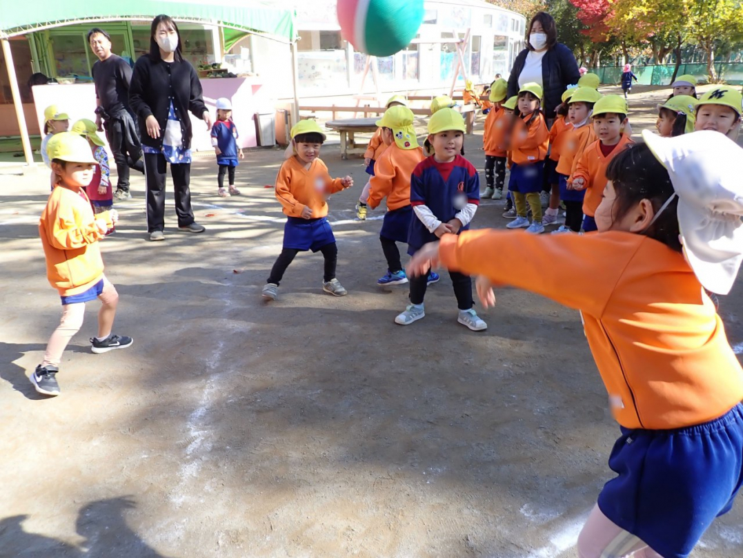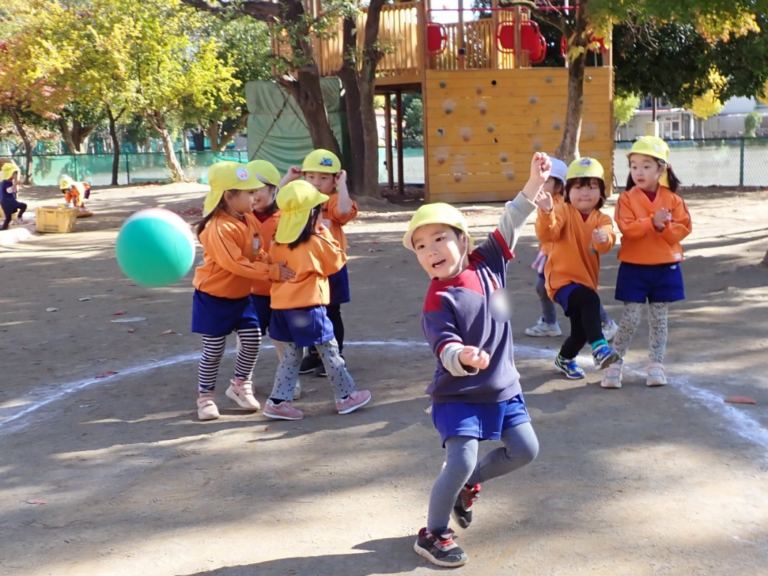 運動するのも気持ち良い秋空のもと、外での体操で「円形ドッチボール」を楽しみました。以前に楽しんでいた「ころがしドッチボール」から、ボールを投げる分「パワーアップ!」です。