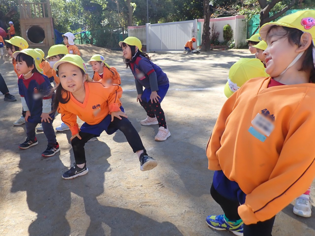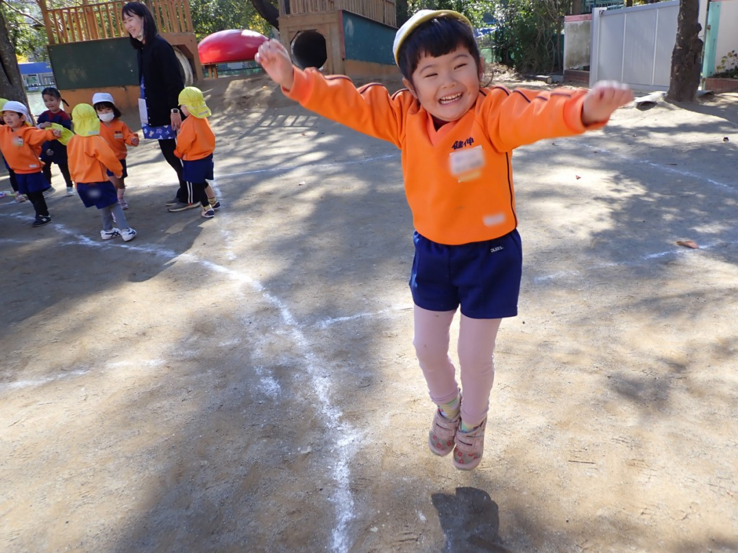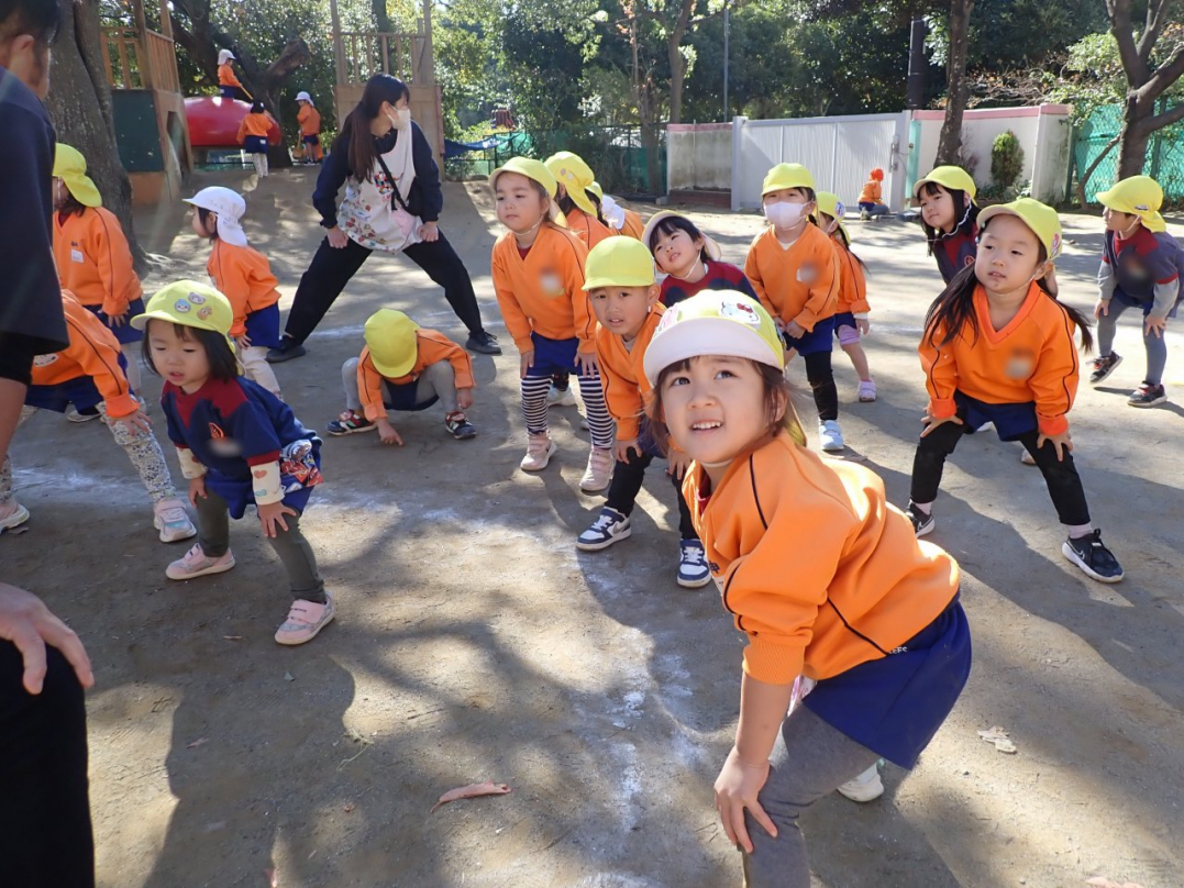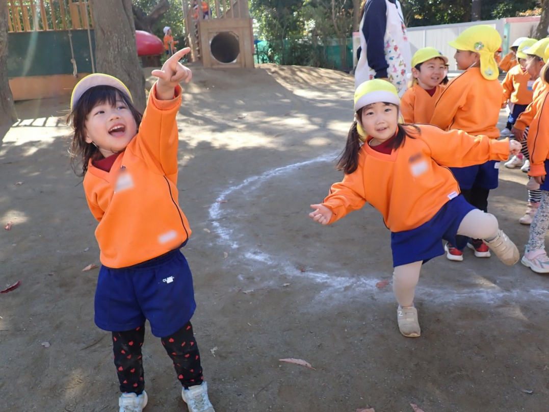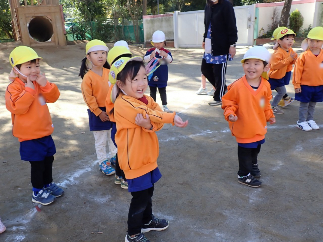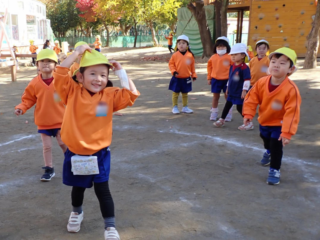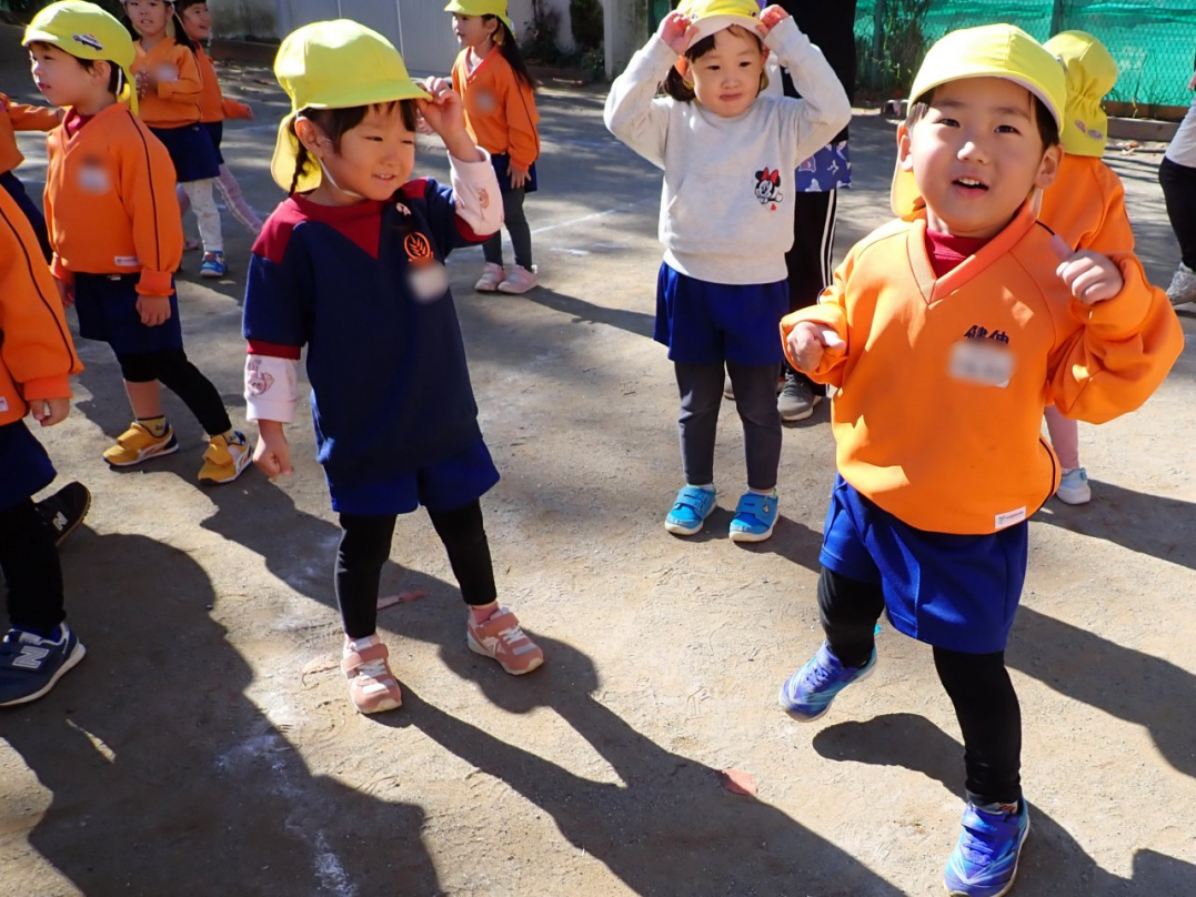 運動するのも気持ち良い秋空のもと、外での体操で「円形ドッチボール」を楽しみました。以前に楽しんでいた「ころがしドッチボール」から、ボールを投げる分「パワーアップ!」です。