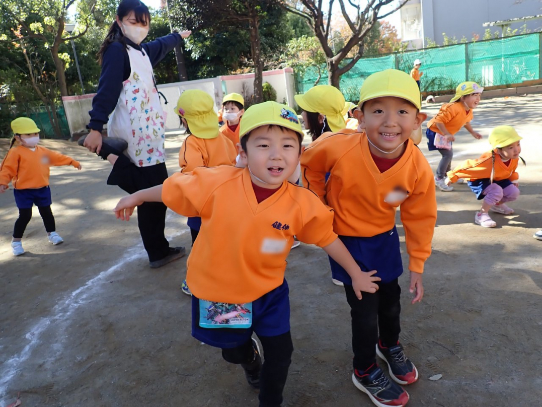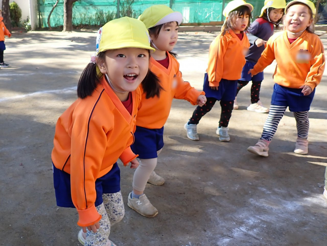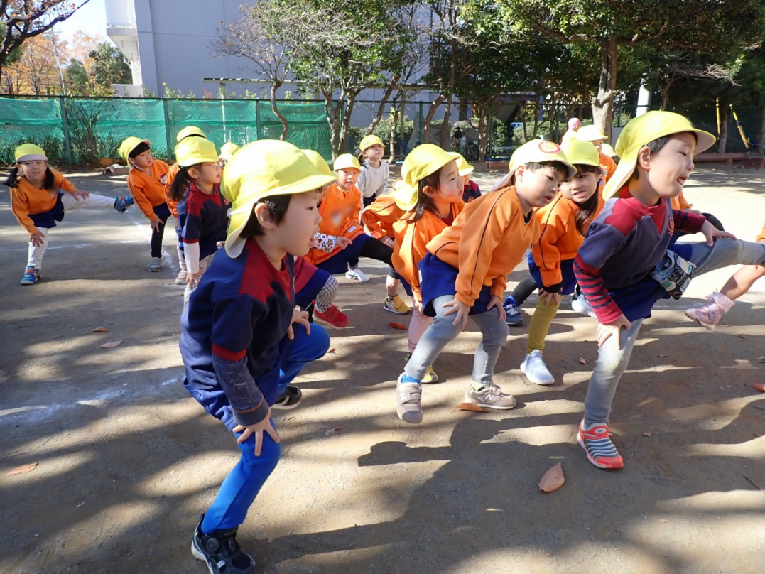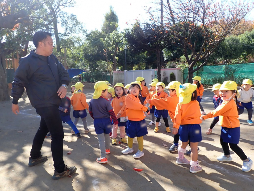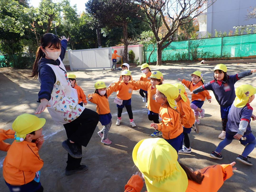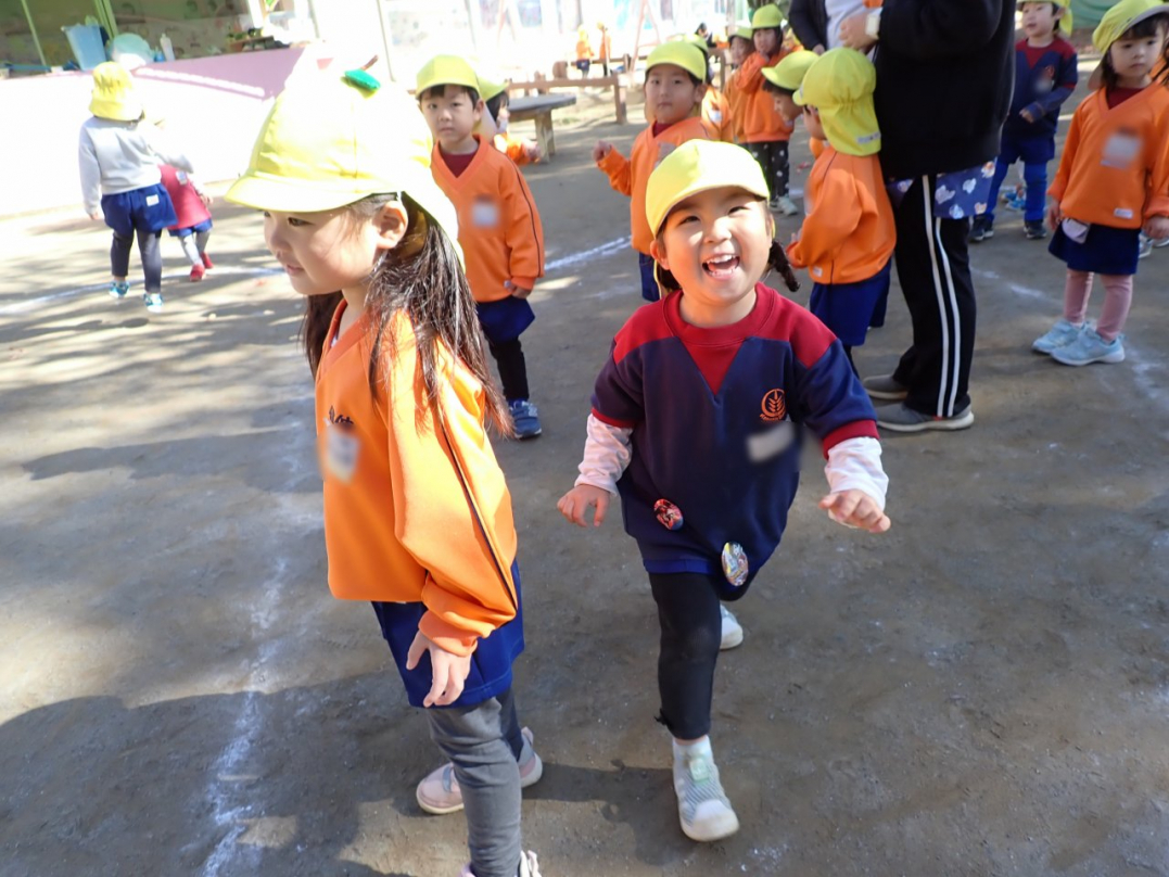 運動するのも気持ち良い秋空のもと、外での体操で「円形ドッチボール」を楽しみました。以前に楽しんでいた「ころがしドッチボール」から、ボールを投げる分「パワーアップ!」です。