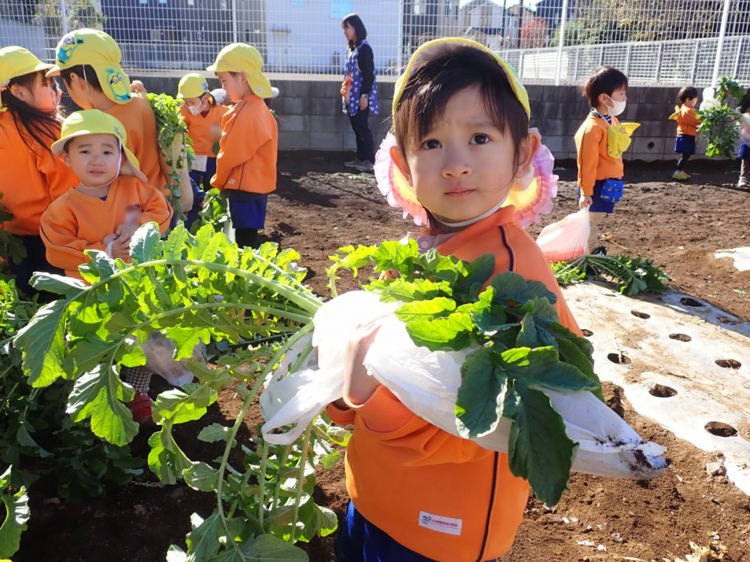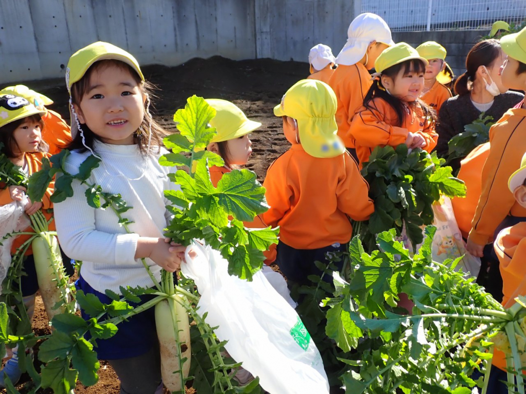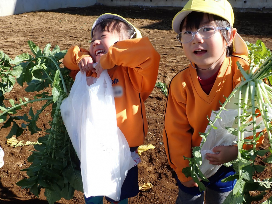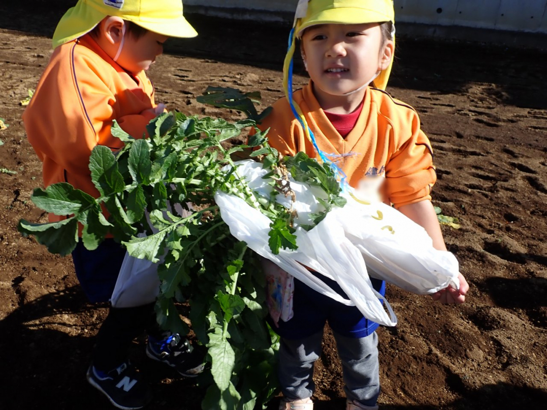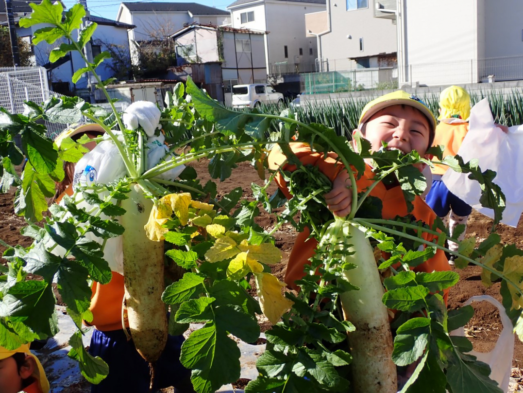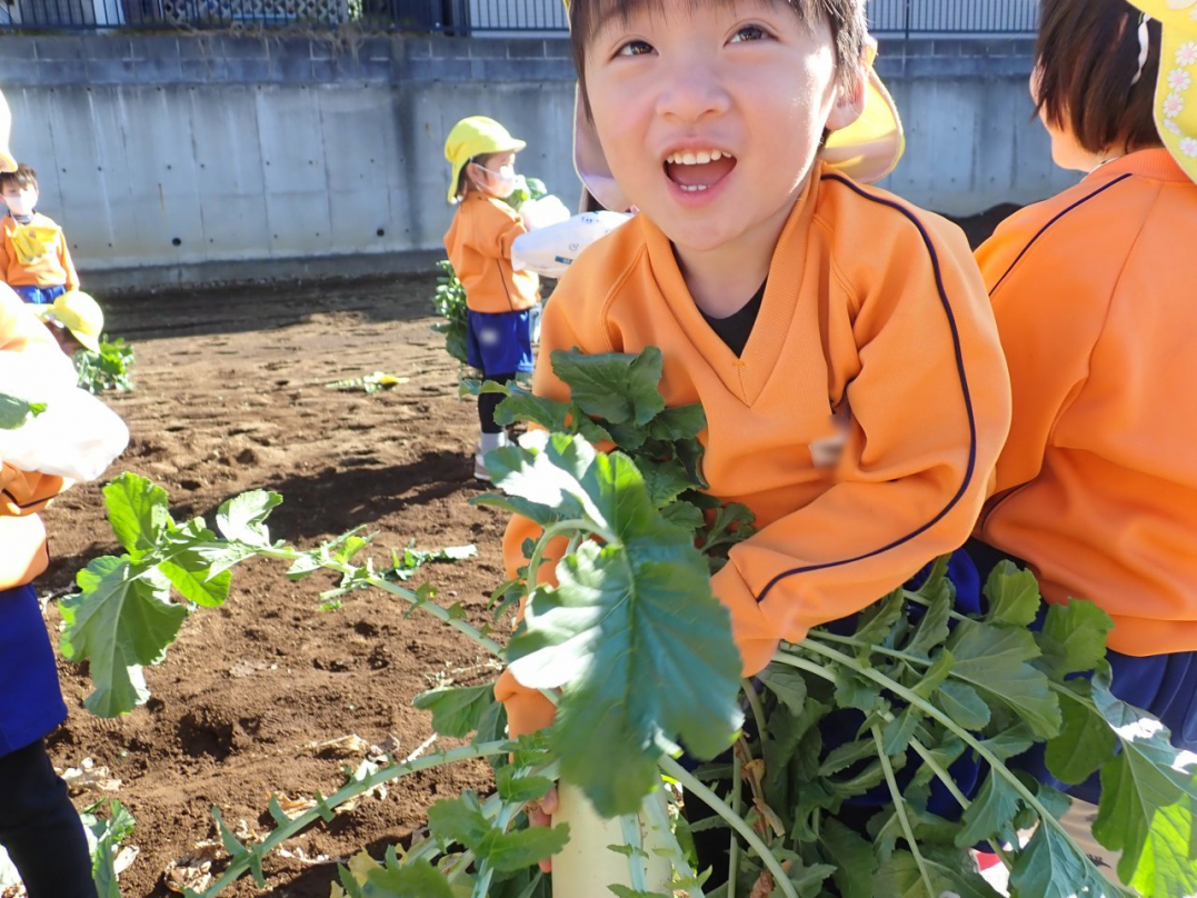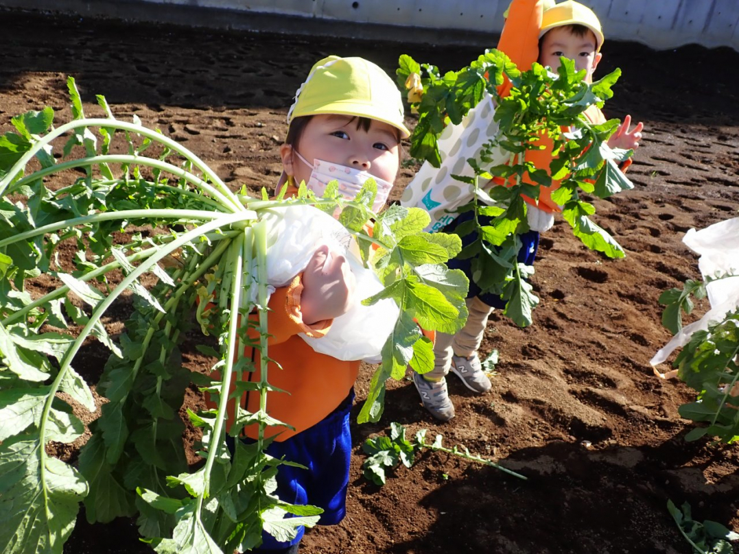 大根の葉っぱをしっかり持って、思いっきり引っ張ると…土から大きな大根が抜けました。「見て!こんな大きい大根だよ」「わたしのだって、こんな大きいよ」「白くてすべすべだね」子ども達は大喜びでした。ご家族みんなで美味しい大根を食べてね♪