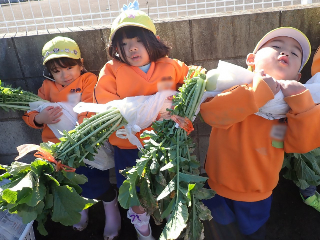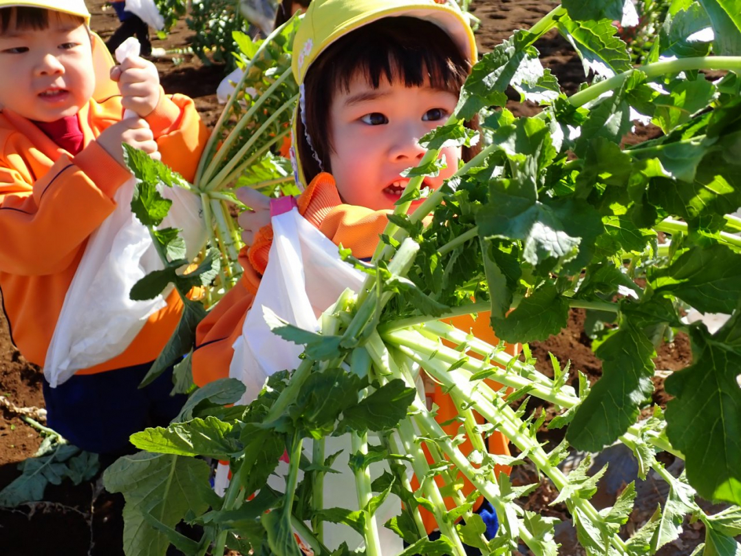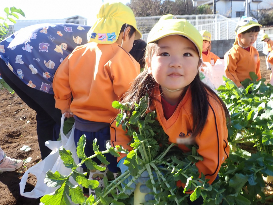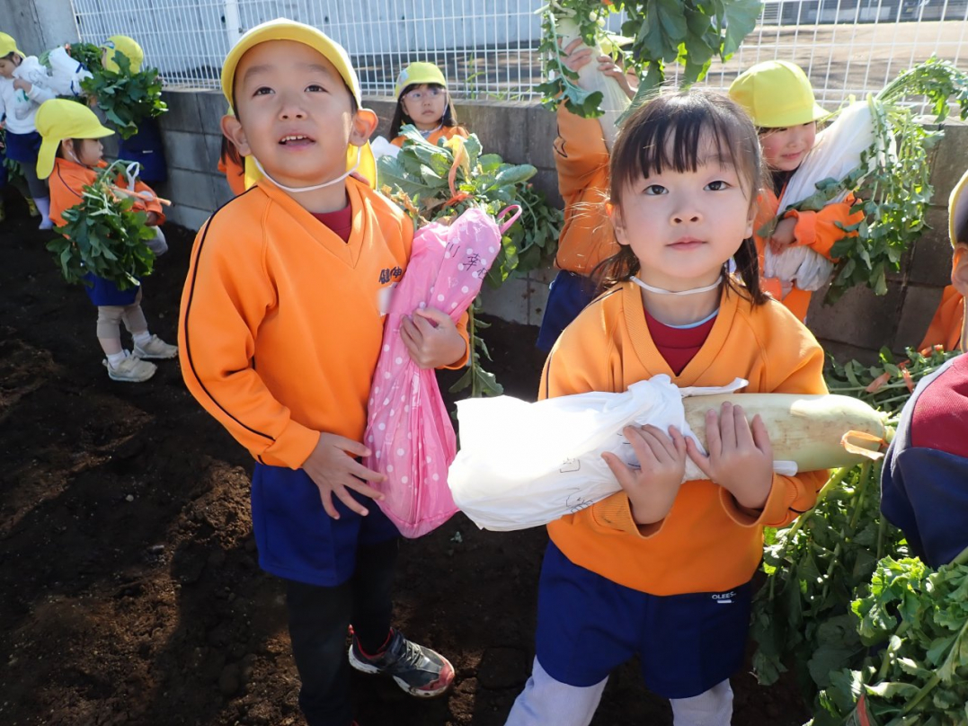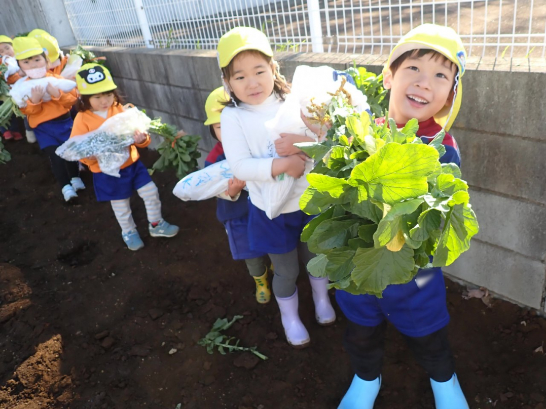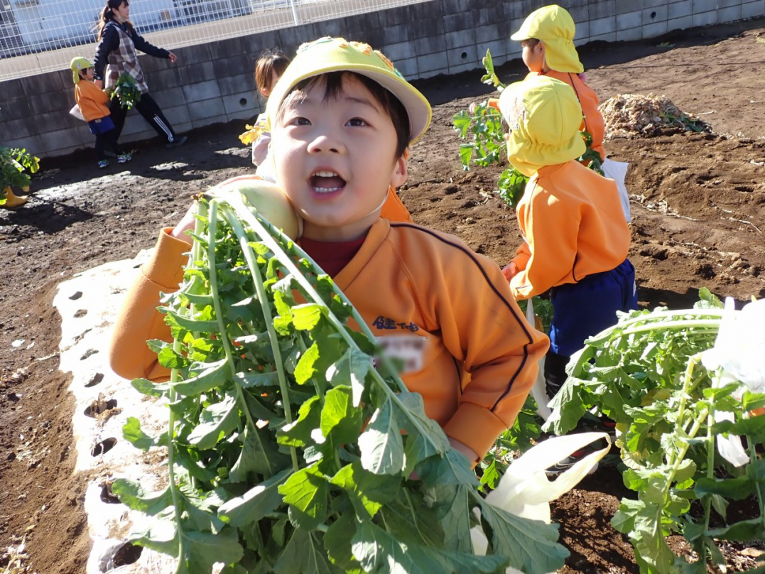 大根の葉っぱをしっかり持って、思いっきり引っ張ると…土から大きな大根が抜けました。「見て!こんな大きい大根だよ」「わたしのだって、こんな大きいよ」「白くてすべすべだね」子ども達は大喜びでした。ご家族みんなで美味しい大根を食べてね♪