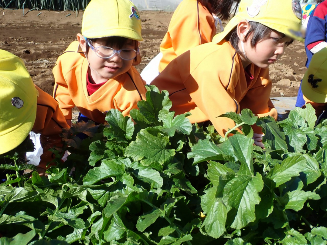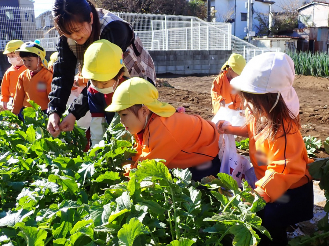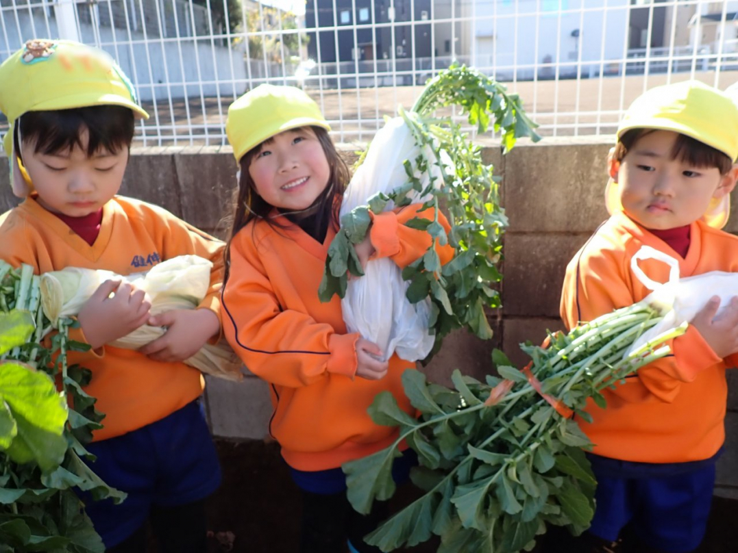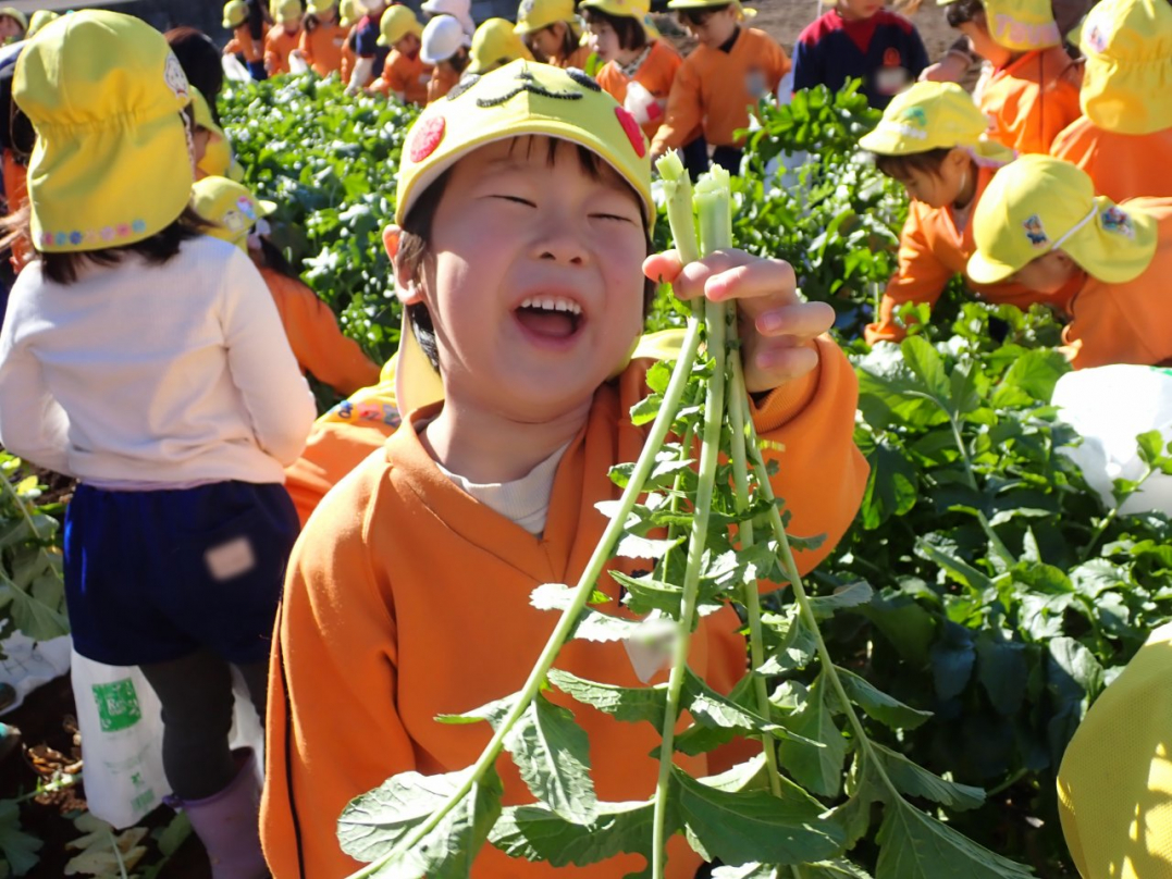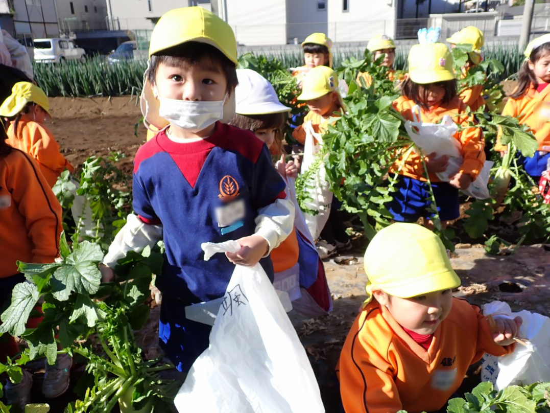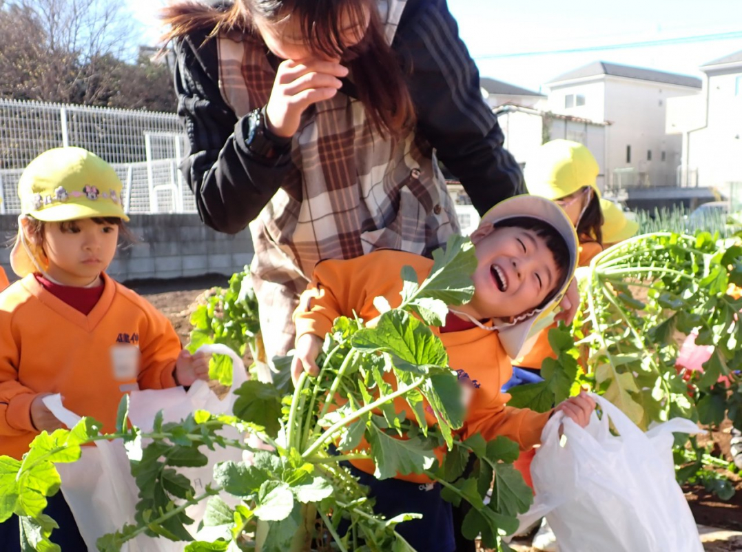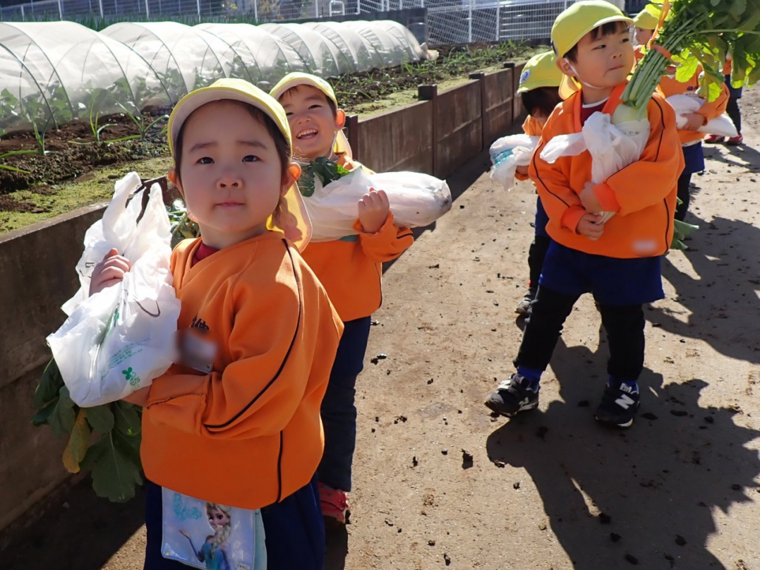 大根の葉っぱをしっかり持って、思いっきり引っ張ると…土から大きな大根が抜けました。「見て!こんな大きい大根だよ」「わたしのだって、こんな大きいよ」「白くてすべすべだね」子ども達は大喜びでした。ご家族みんなで美味しい大根を食べてね♪