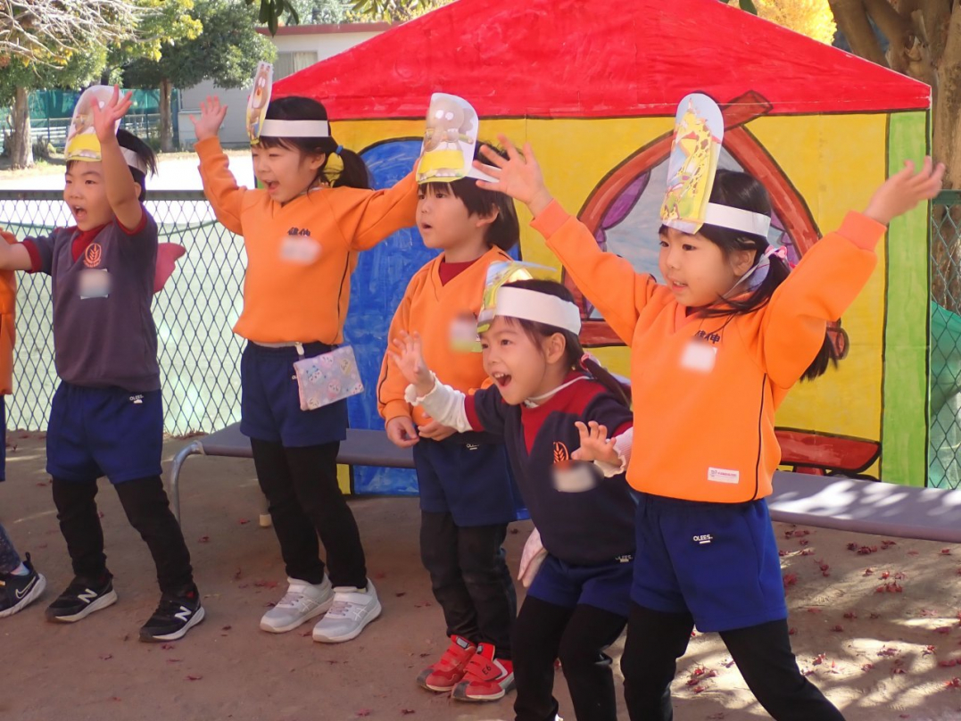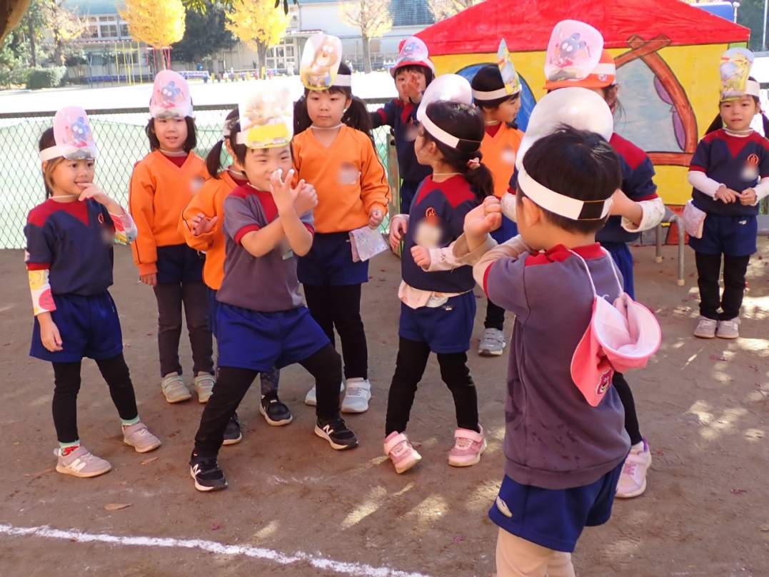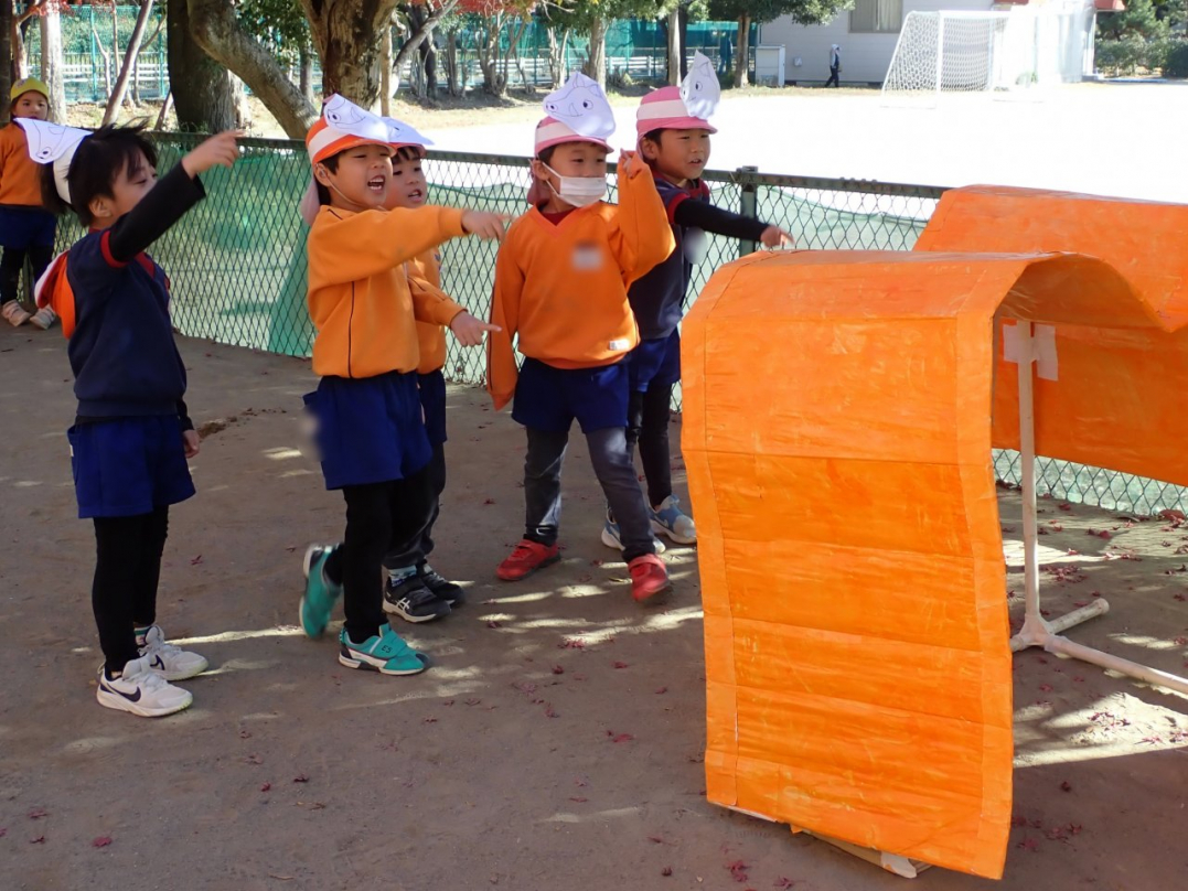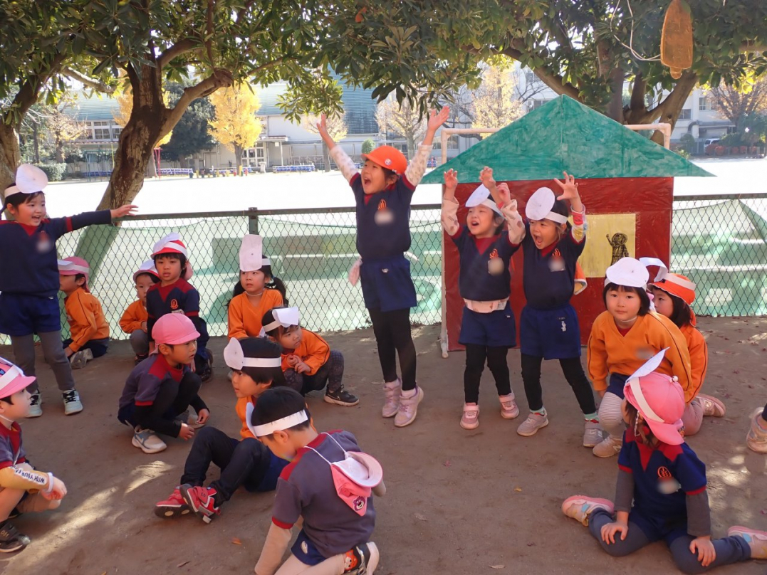 表現が終わった後、子ども達は好きな劇・やりたい役を選んで、劇ゴッコを楽しんでいました。自分のクラス以外の劇は、きっと新鮮だったのでしょうね。カナリヤ組やひばり組のお客さんを前に、みんな楽しんでいましたよ♪