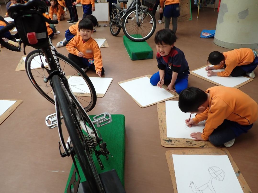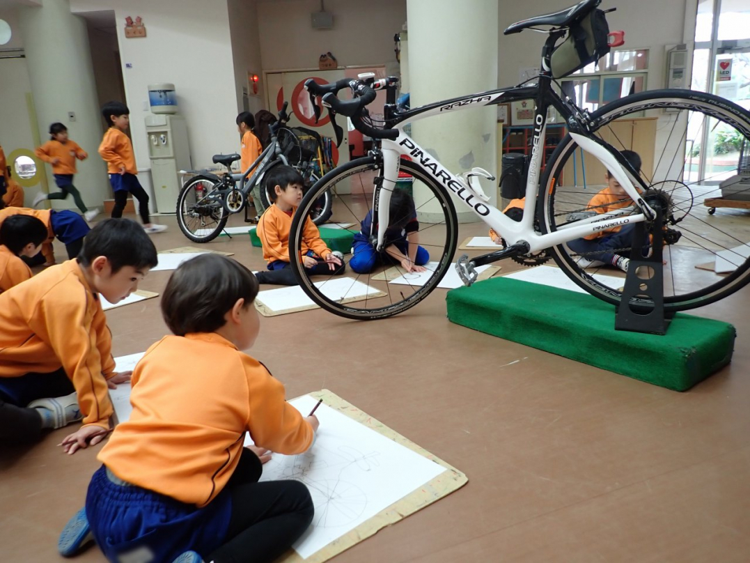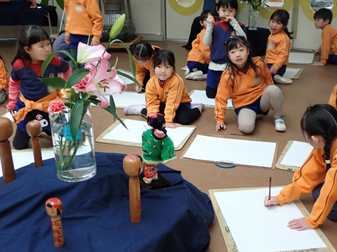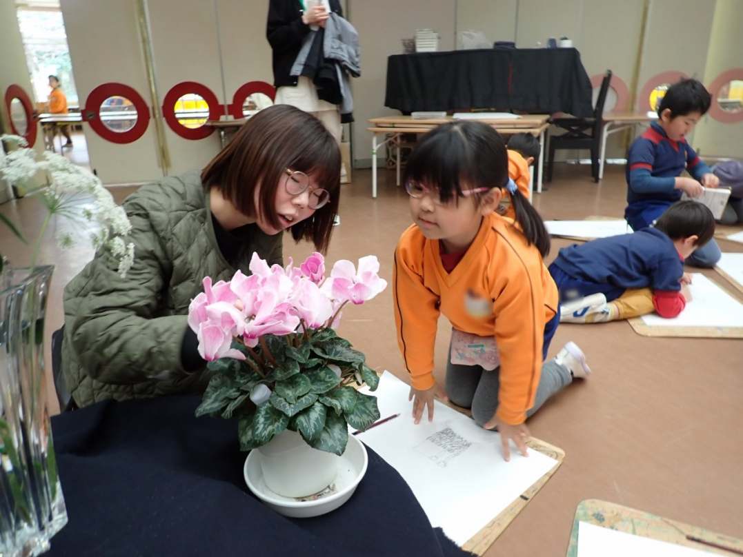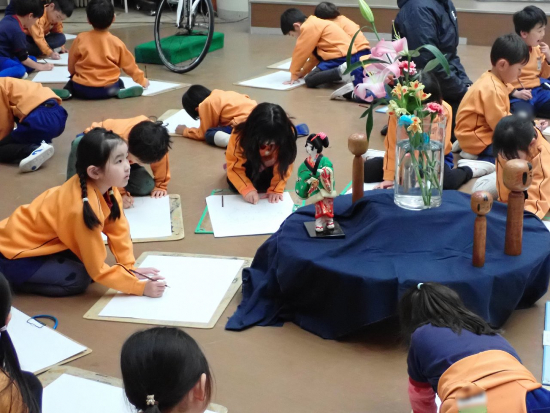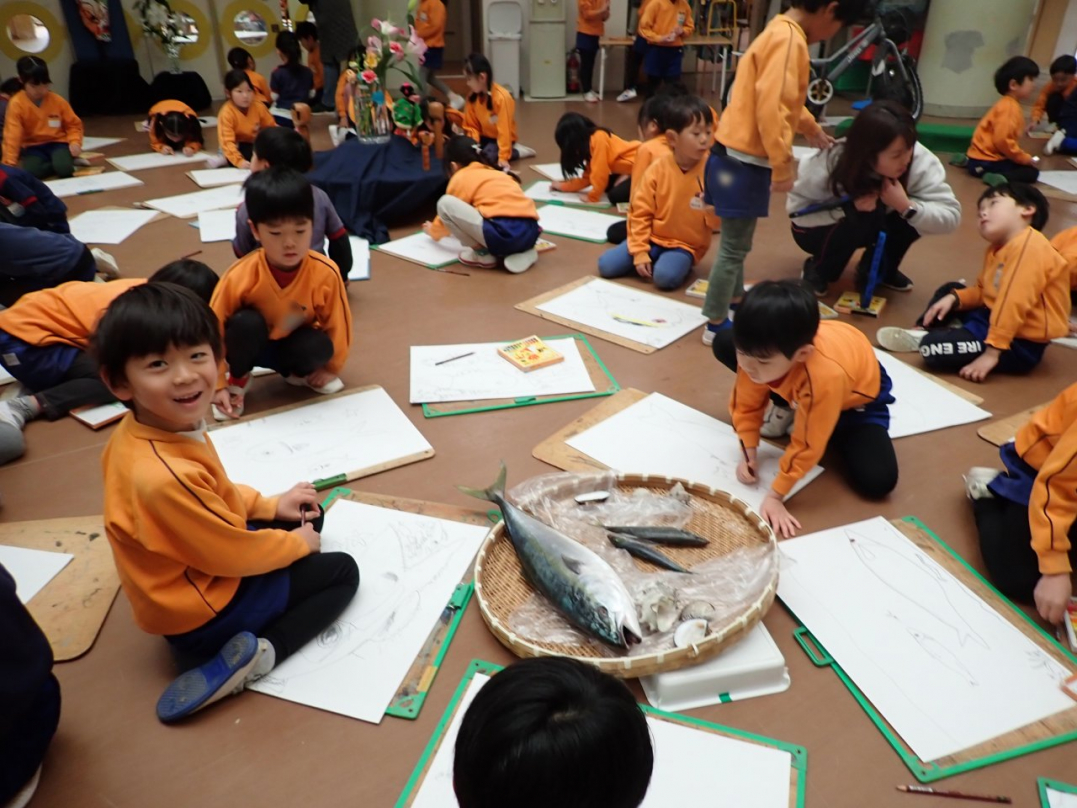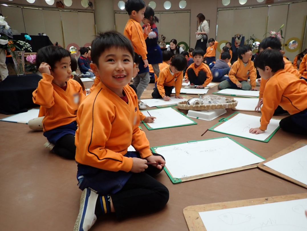 今回、ひばり組は幼稚園ホールに集まって、新鮮な魚や色とりどりの花、きれいな羽子板やカッコいい自転車等を目の前に、自分が好きな絵を描きました。みんな、楽しそうに素敵な描いていましたね♪