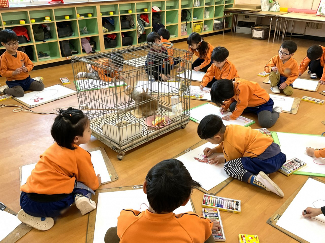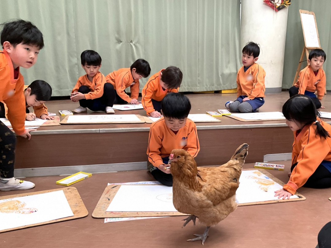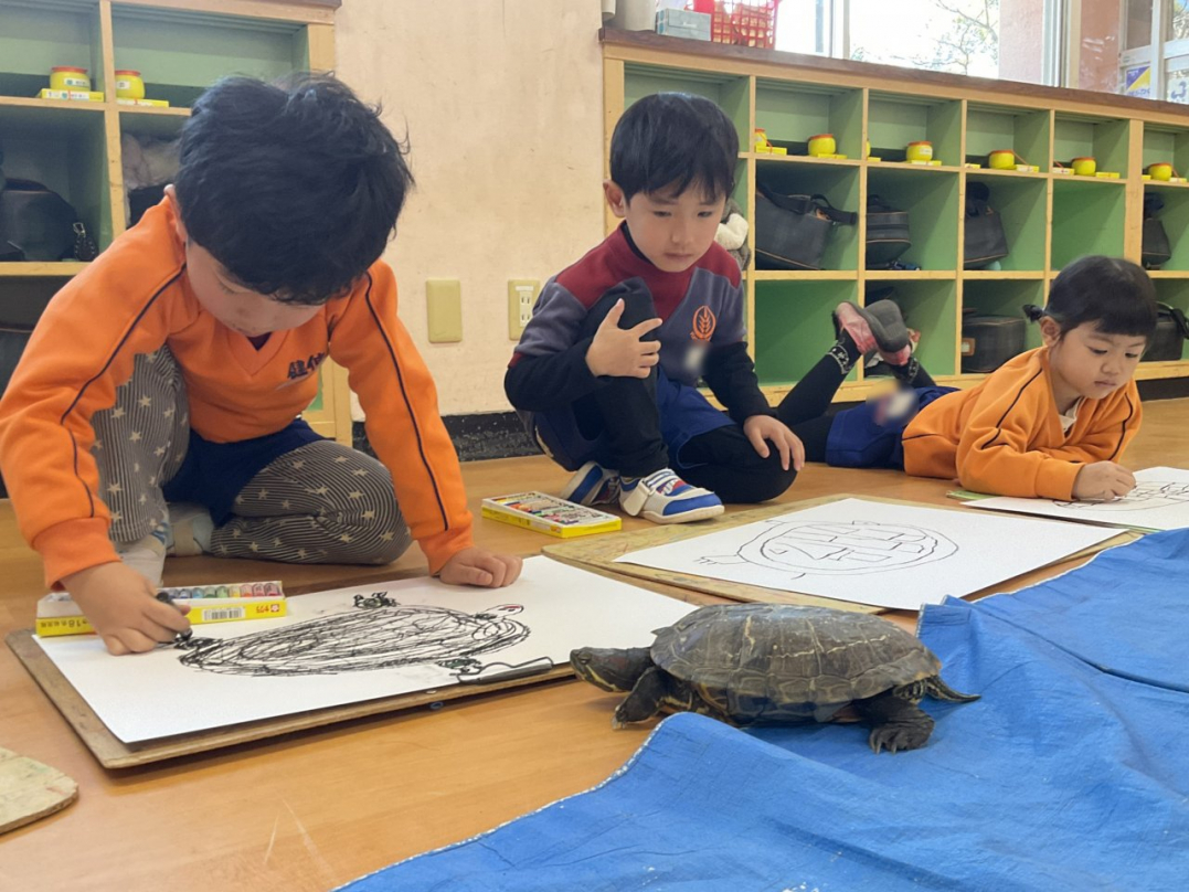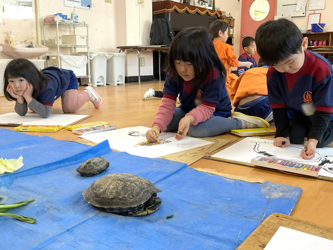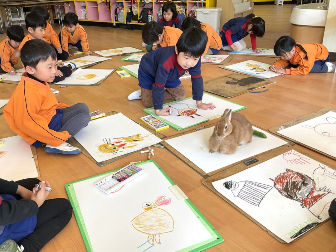 さっそくつばめ組では、みんなが大好きなウサギや亀やチャボ、それから友達の顔も描きました。好きな絵を描くことを楽しんで下さいね♪