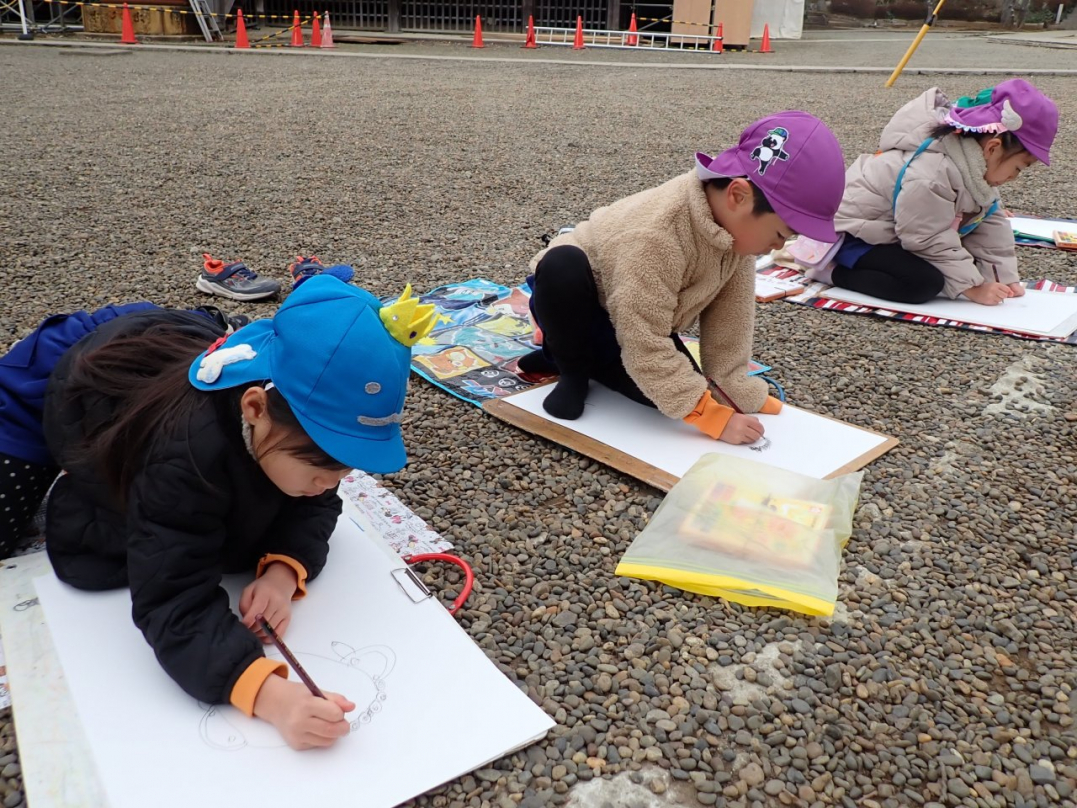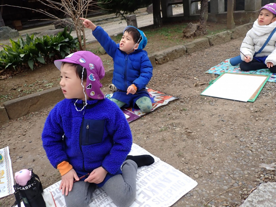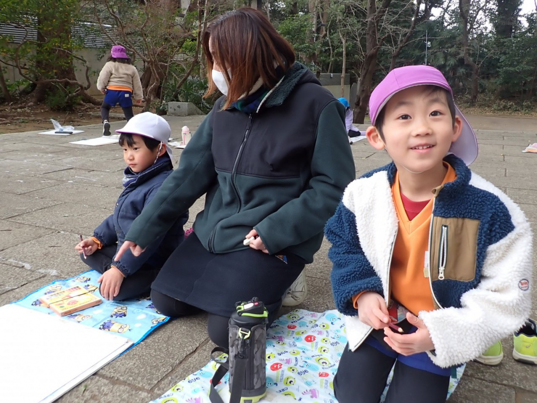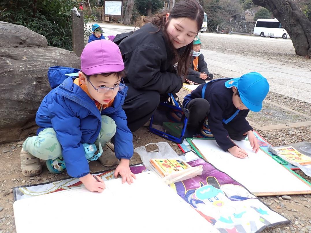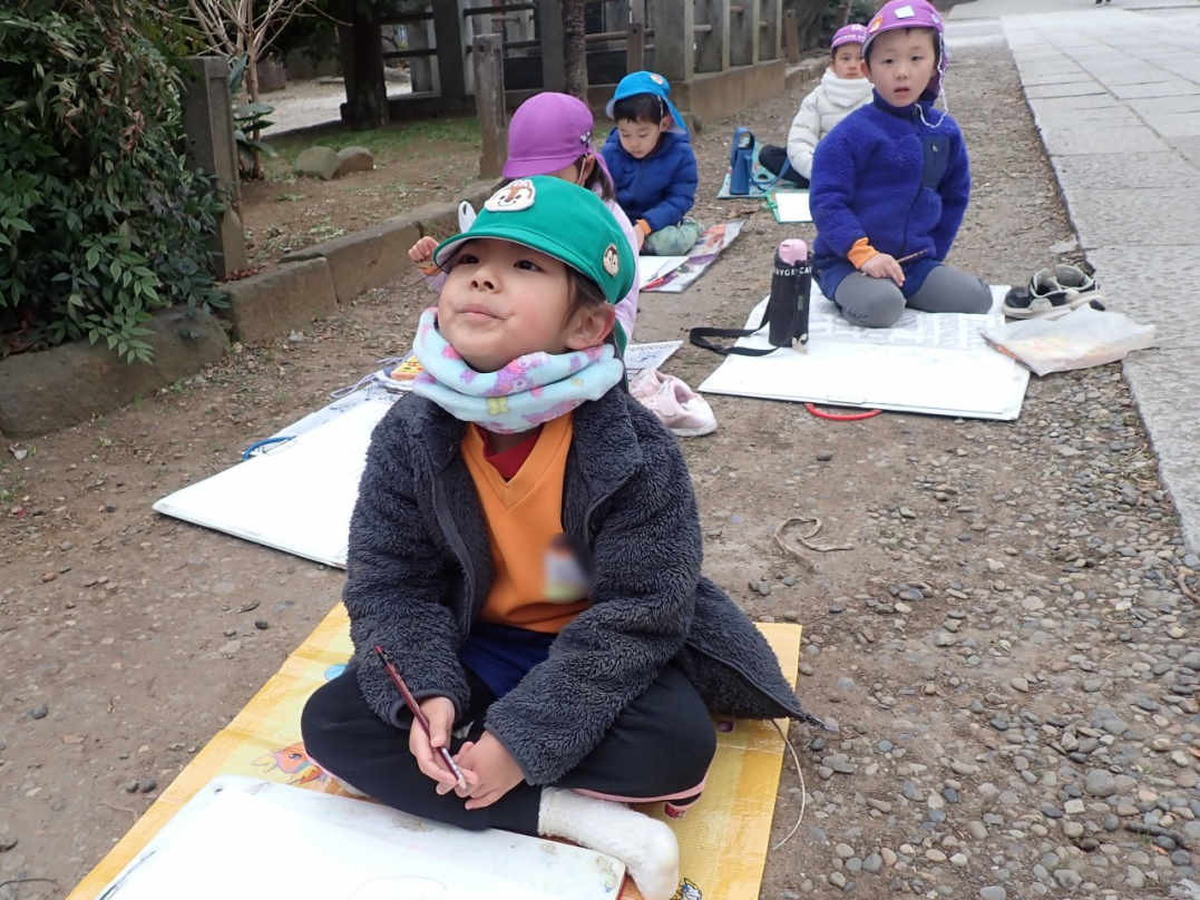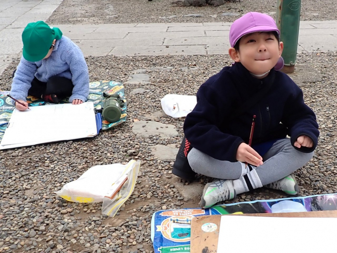 ひばり組になると、園バスに乗って絵を描きに出掛けます。いくつかの中から自分が選択したお気に入りのコースに行きますから、出来上がった絵は子ども達の思いがいっぱいこもっています。