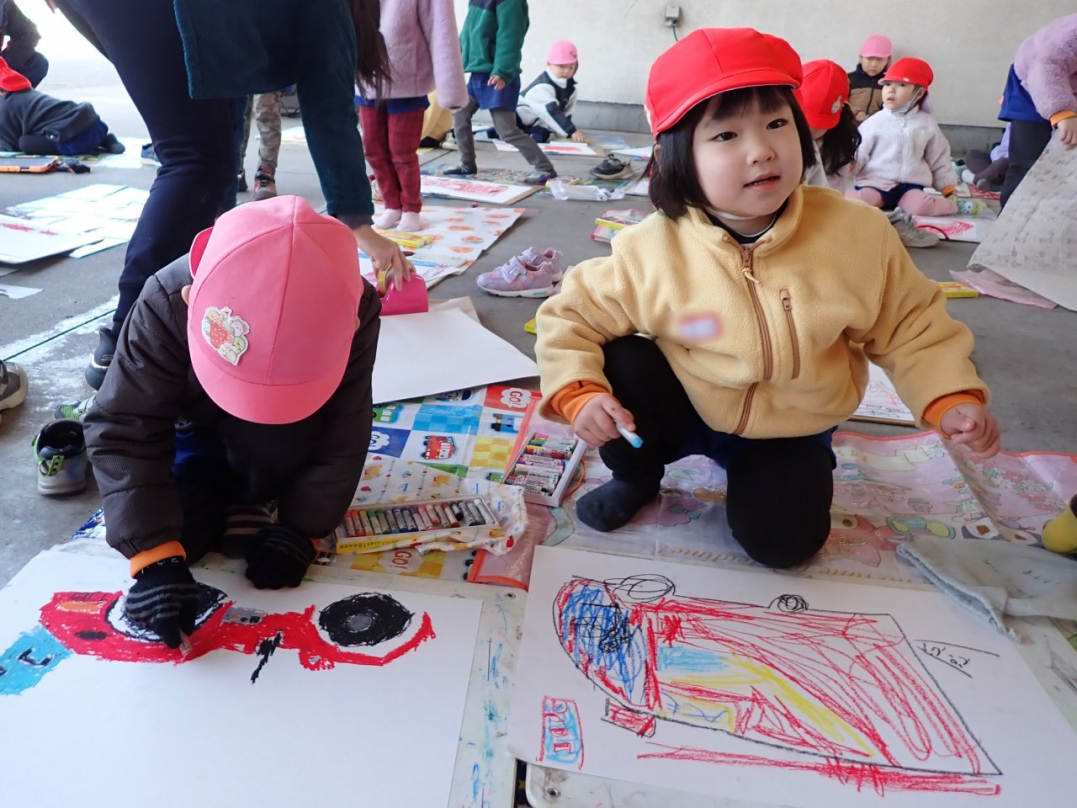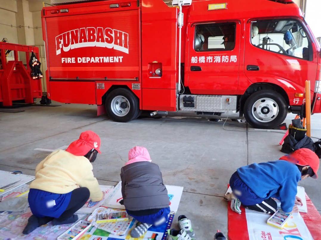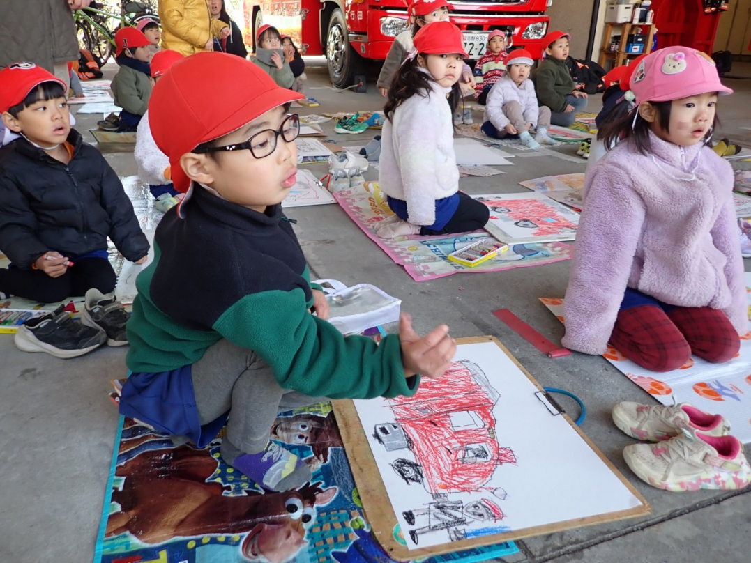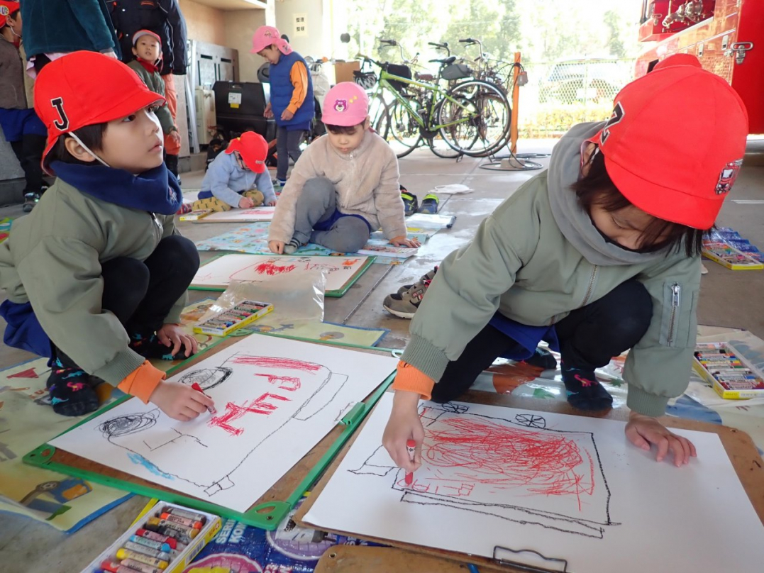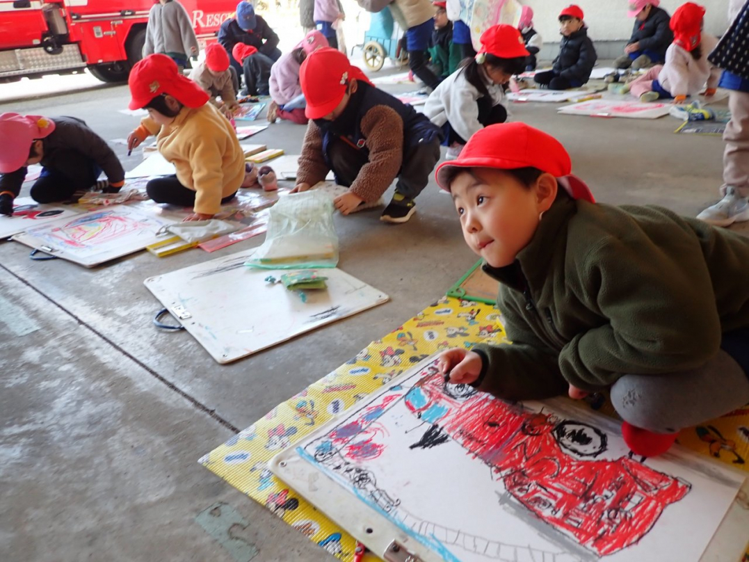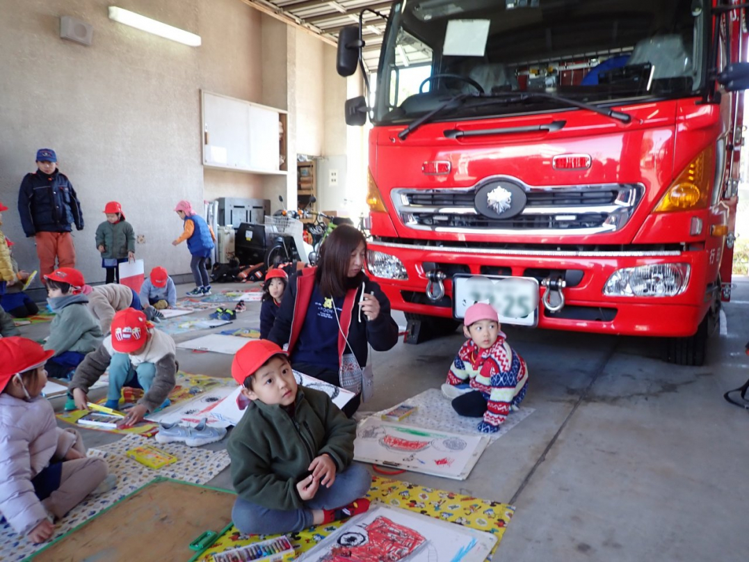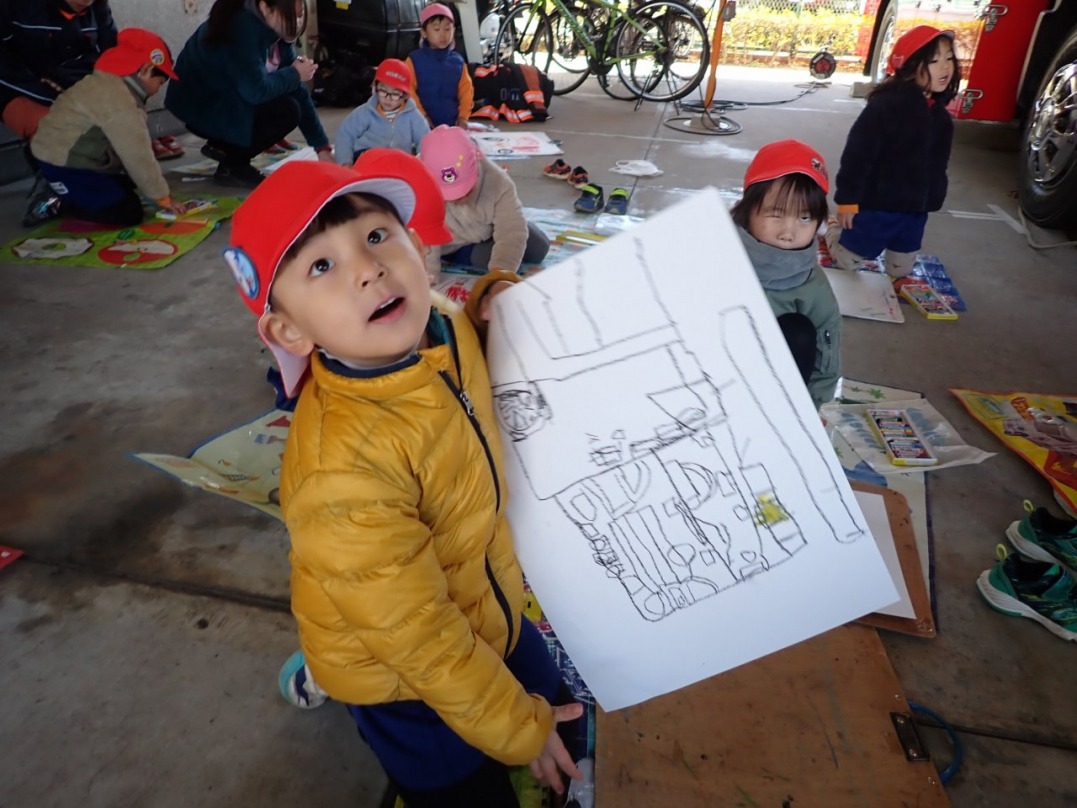 幼稚園の近くの消防署で、消防車の絵を描かせてもらいました。勢いよく水を放水する様子を見せて頂いたり、消防車クイズで色々説明して頂いたりと、とても貴重な体験の連続で、子ども達は興味津々の様子でした。