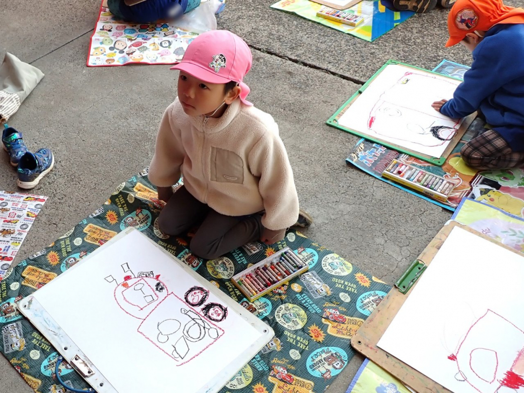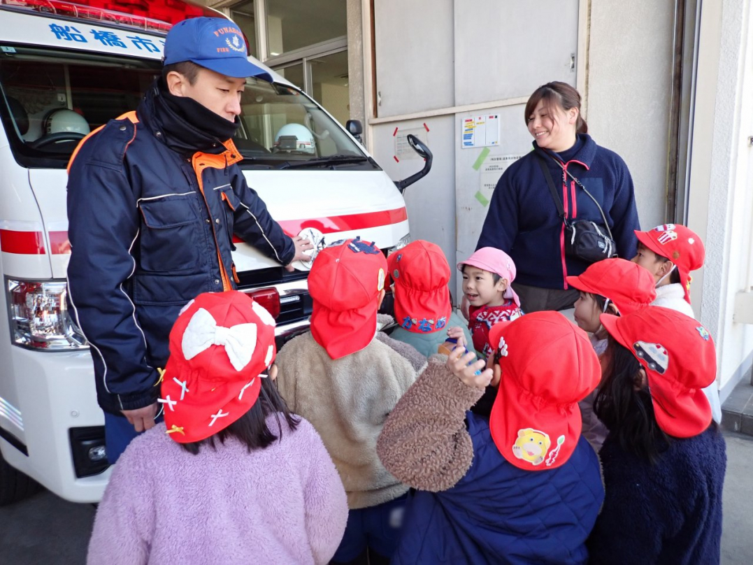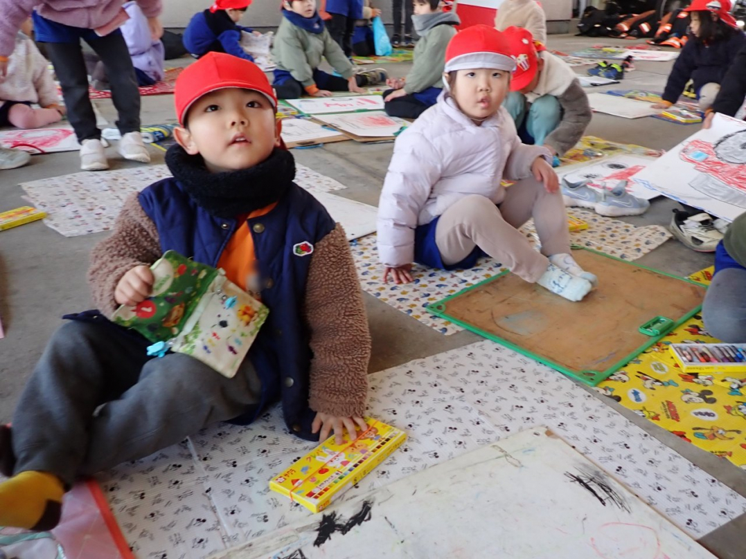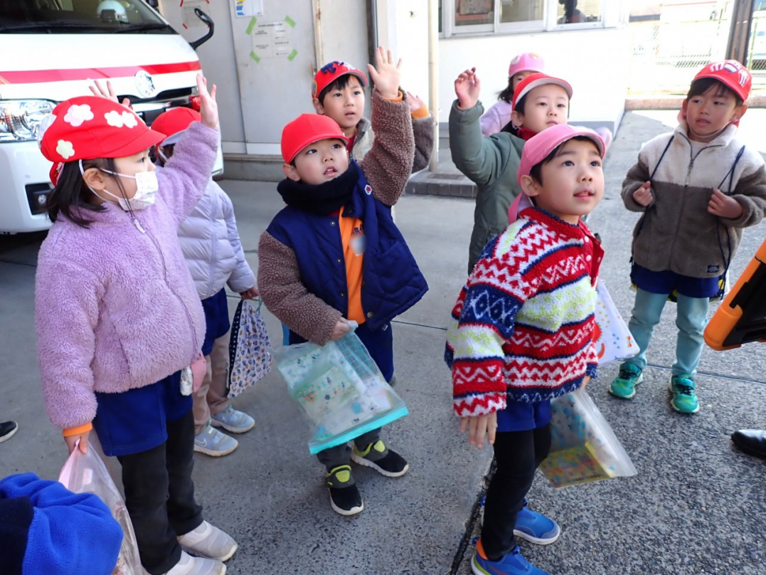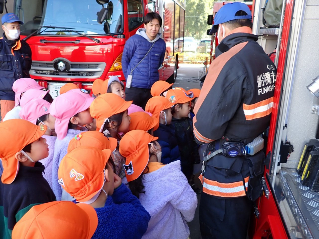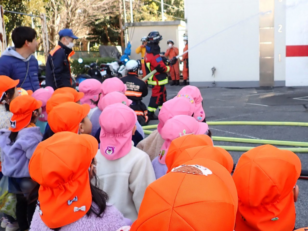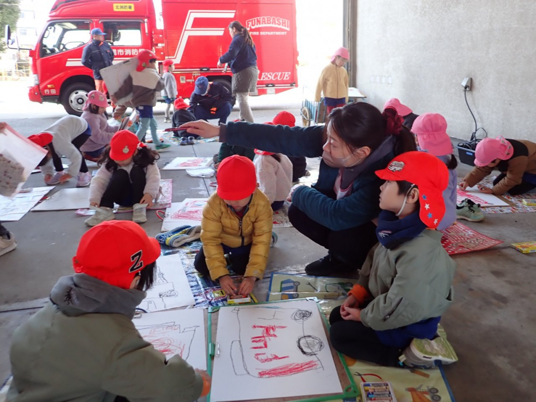 幼稚園の近くの消防署で、消防車の絵を描かせてもらいました。勢いよく水を放水する様子を見せて頂いたり、消防車クイズで色々説明して頂いたりと、とても貴重な体験の連続で、子ども達は興味津々の様子でした。