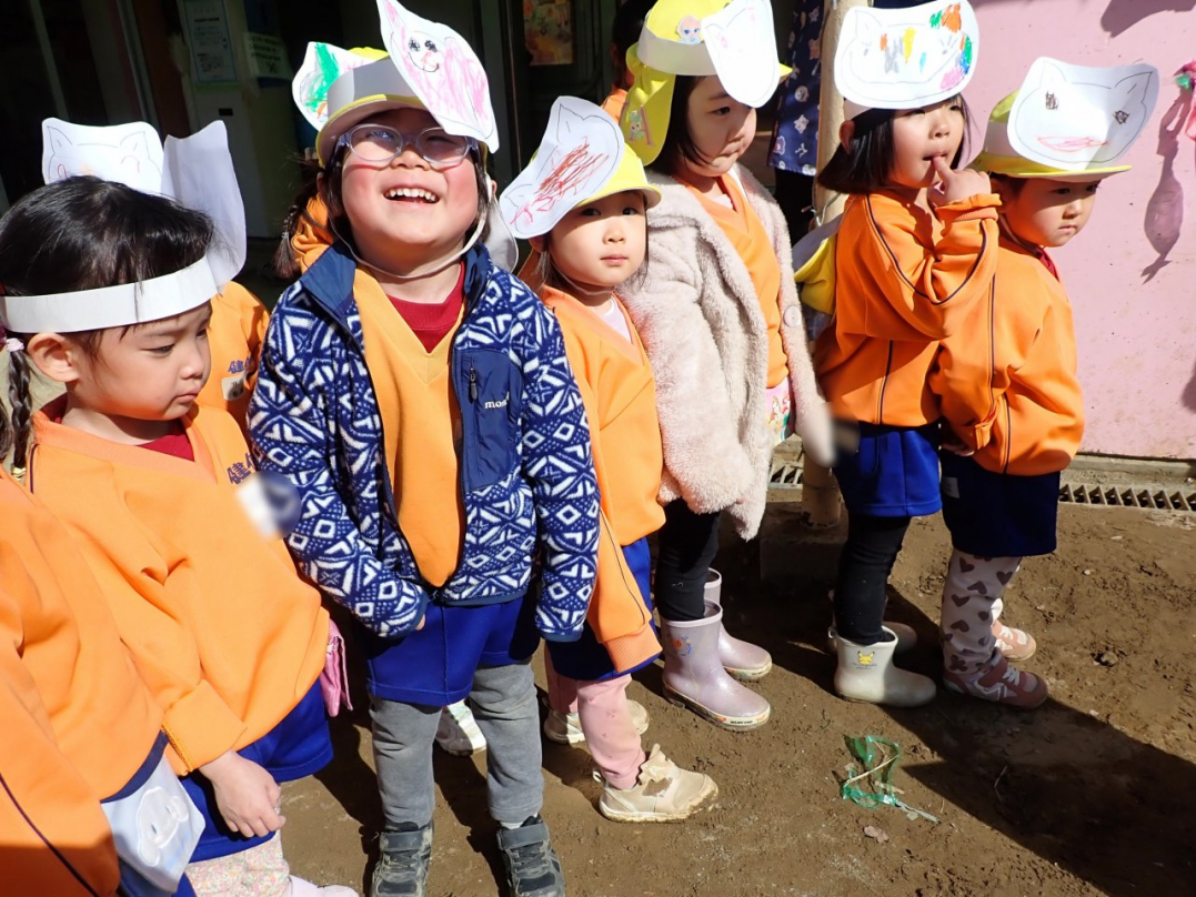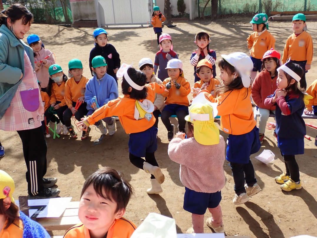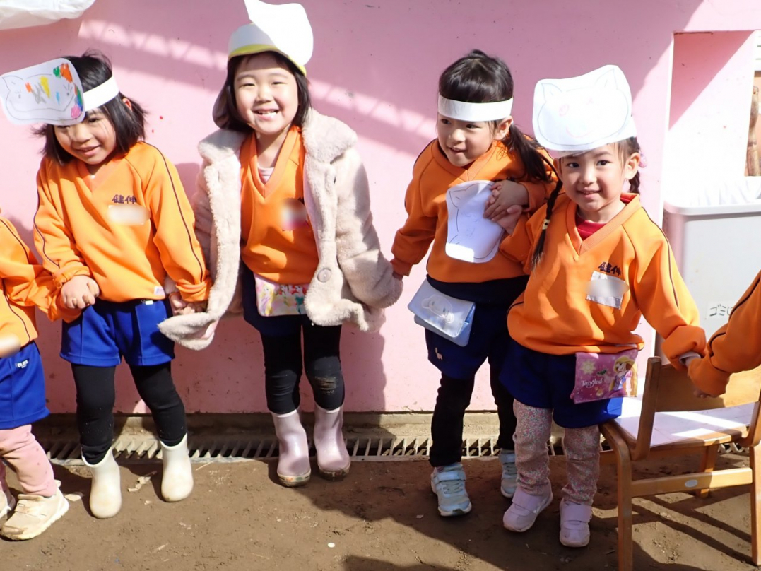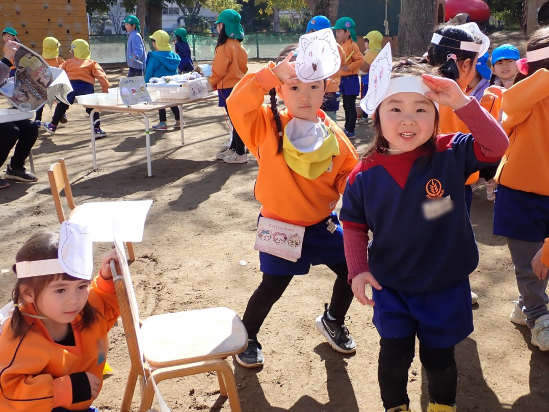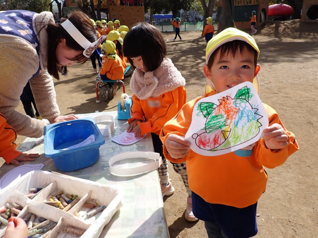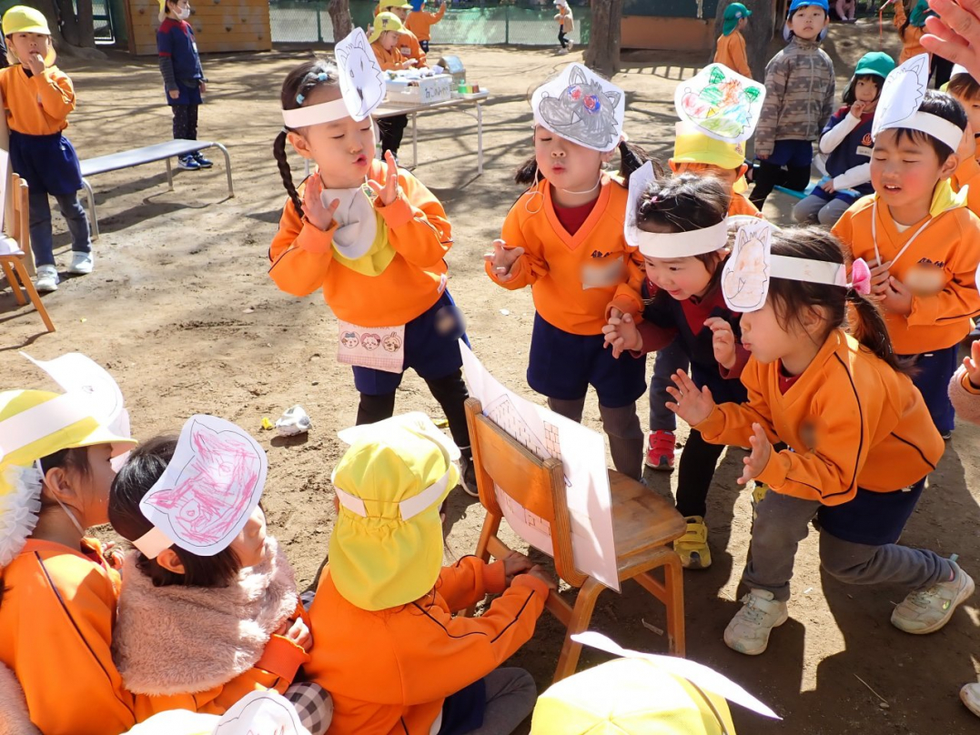 絵本に登場する「おおかみ」や「こぶた」の中から、好きな役を選んでお面を作ったら、さっそく音楽に合わせて演じます。コワいおおかみや、かわいいこぶたをイメージしながら、子ども達はそれぞれの役になりきって楽しんでいましたよ。