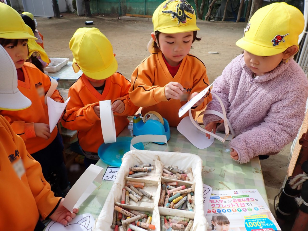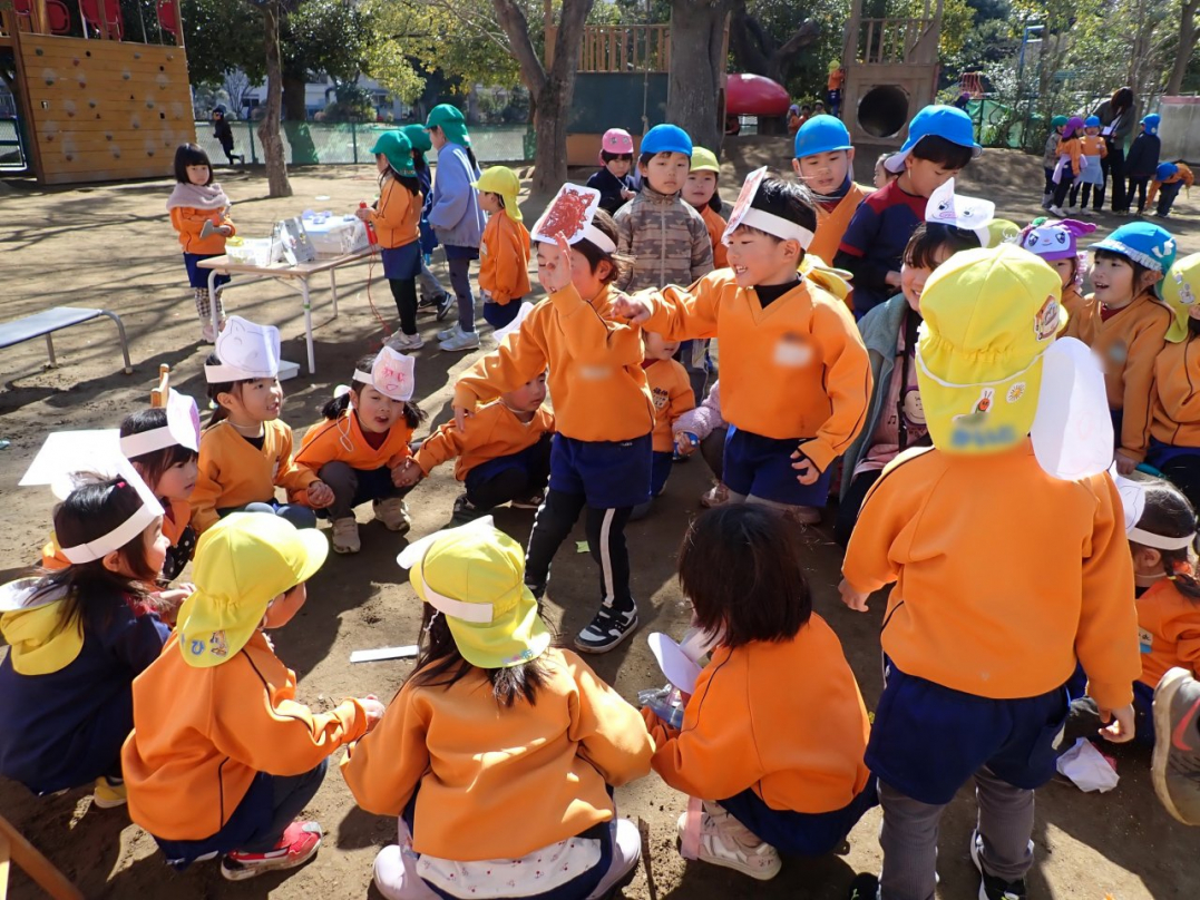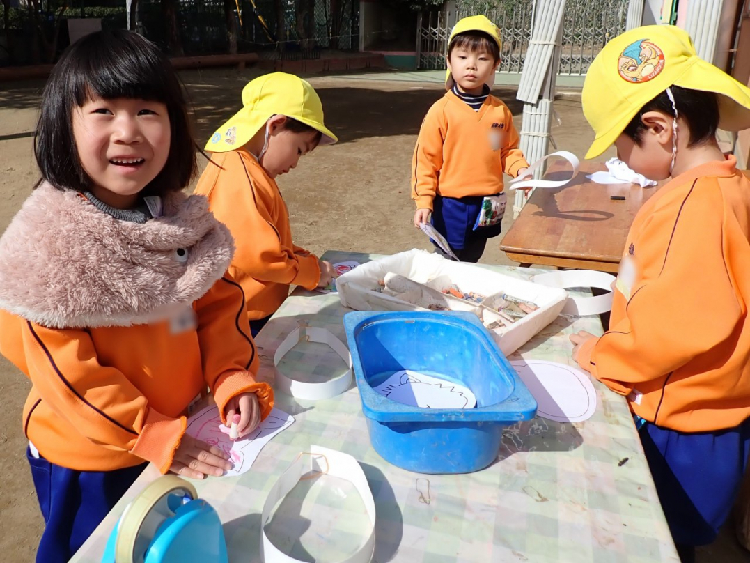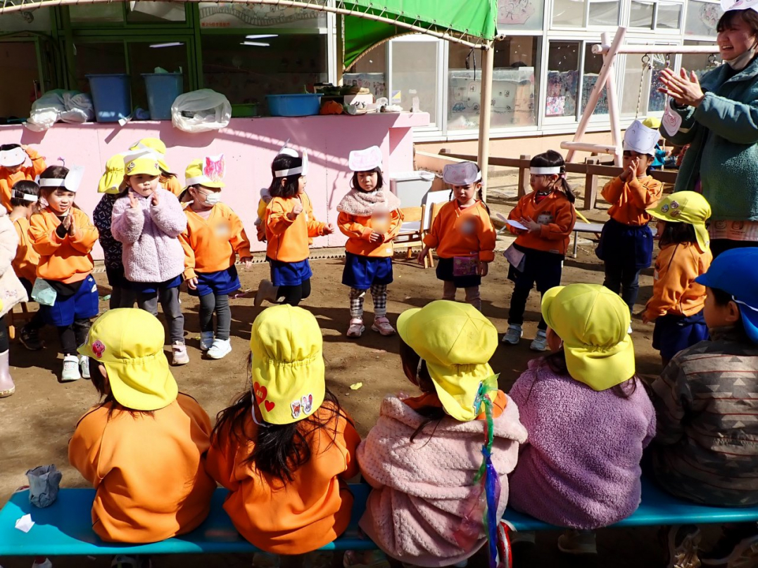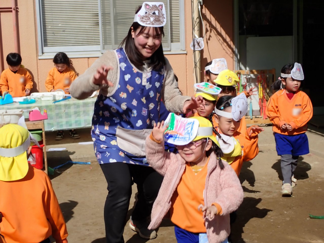絵本に登場する「おおかみ」や「こぶた」の中から、好きな役を選んでお面を作ったら、さっそく音楽に合わせて演じます。コワいおおかみや、かわいいこぶたをイメージしながら、子ども達はそれぞれの役になりきって楽しんでいましたよ。