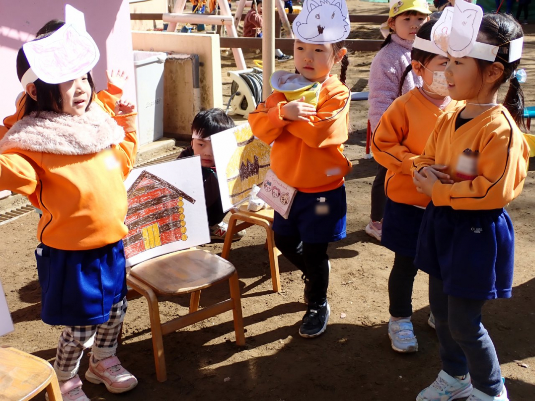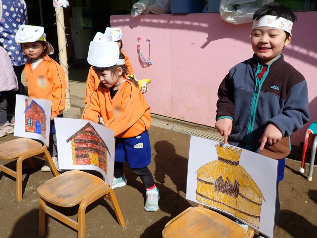 カナリヤ組の子ども達は絵本が大好きです。そこで、おなじみの「3匹のこぶた」の劇をみんなで楽しんでみました。
