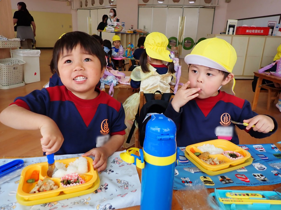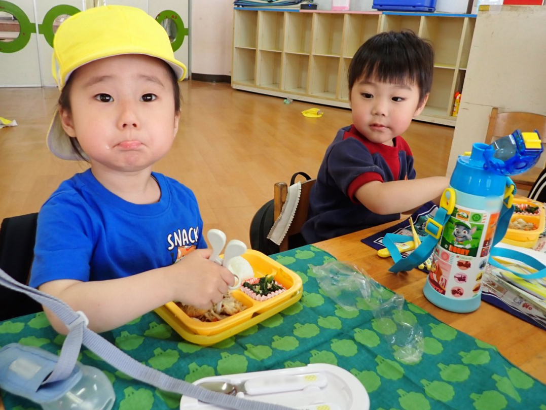今日はカナリヤ組の初めてのランチタイムです。午前中にいっぱい遊んてお腹もペコペコで、子ども達はモリモリとご飯を食べていました♪
